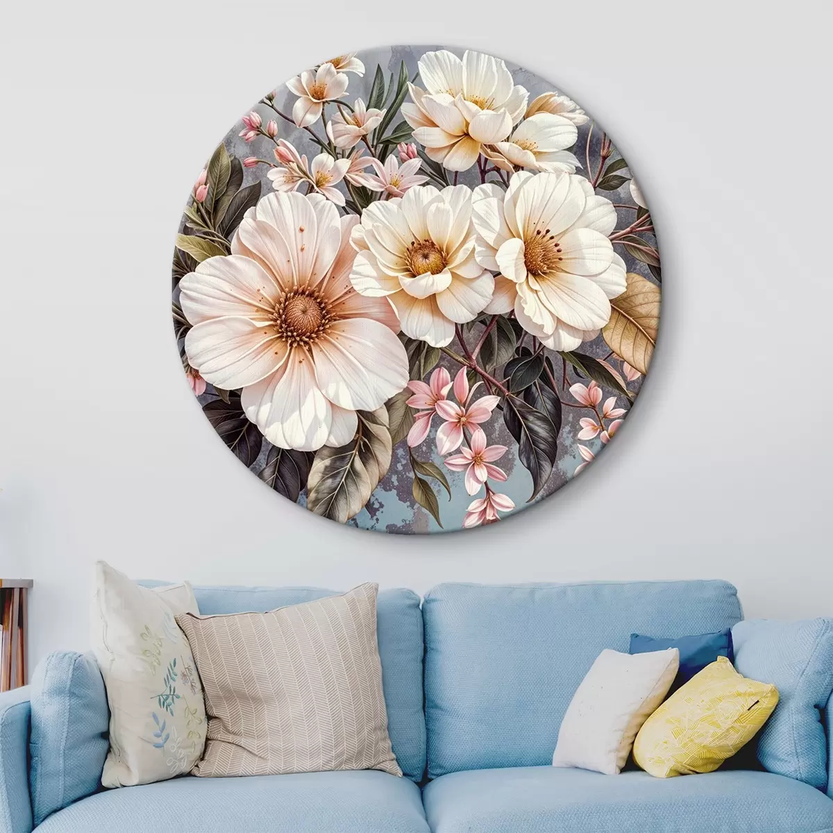 Runde Wandbilder Ein lebhafter Strauß großer, detaillierter weißer und rosafarbener Dahlienblüten mit grünen Blättern vor dunklem Hintergrund r42227