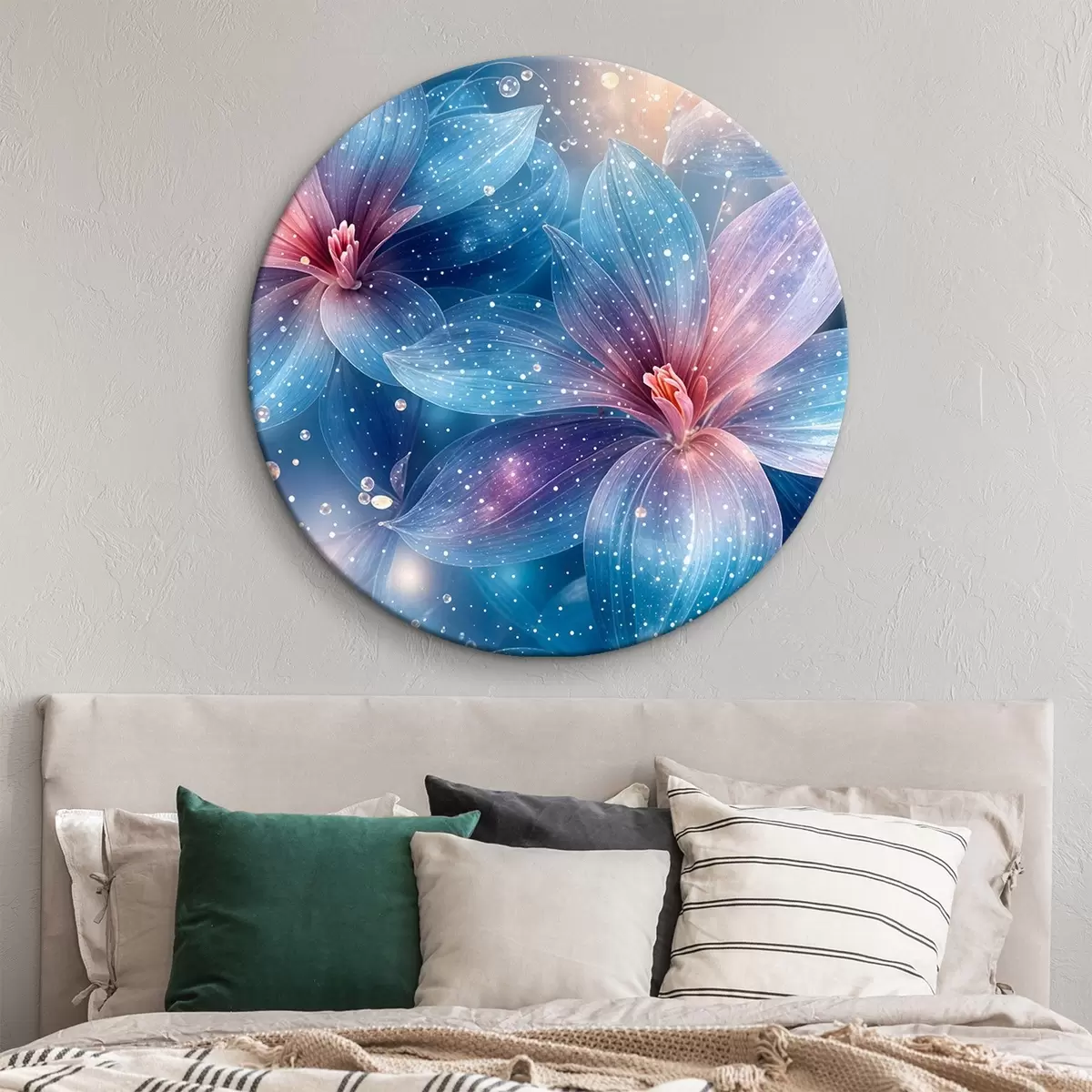 Runde Wandbilder Lebendige und ätherische Blumen mit zarten pastellfarbenen Blütenblättern vor einem verträumten, sternenklaren Hintergrund Nr r42231