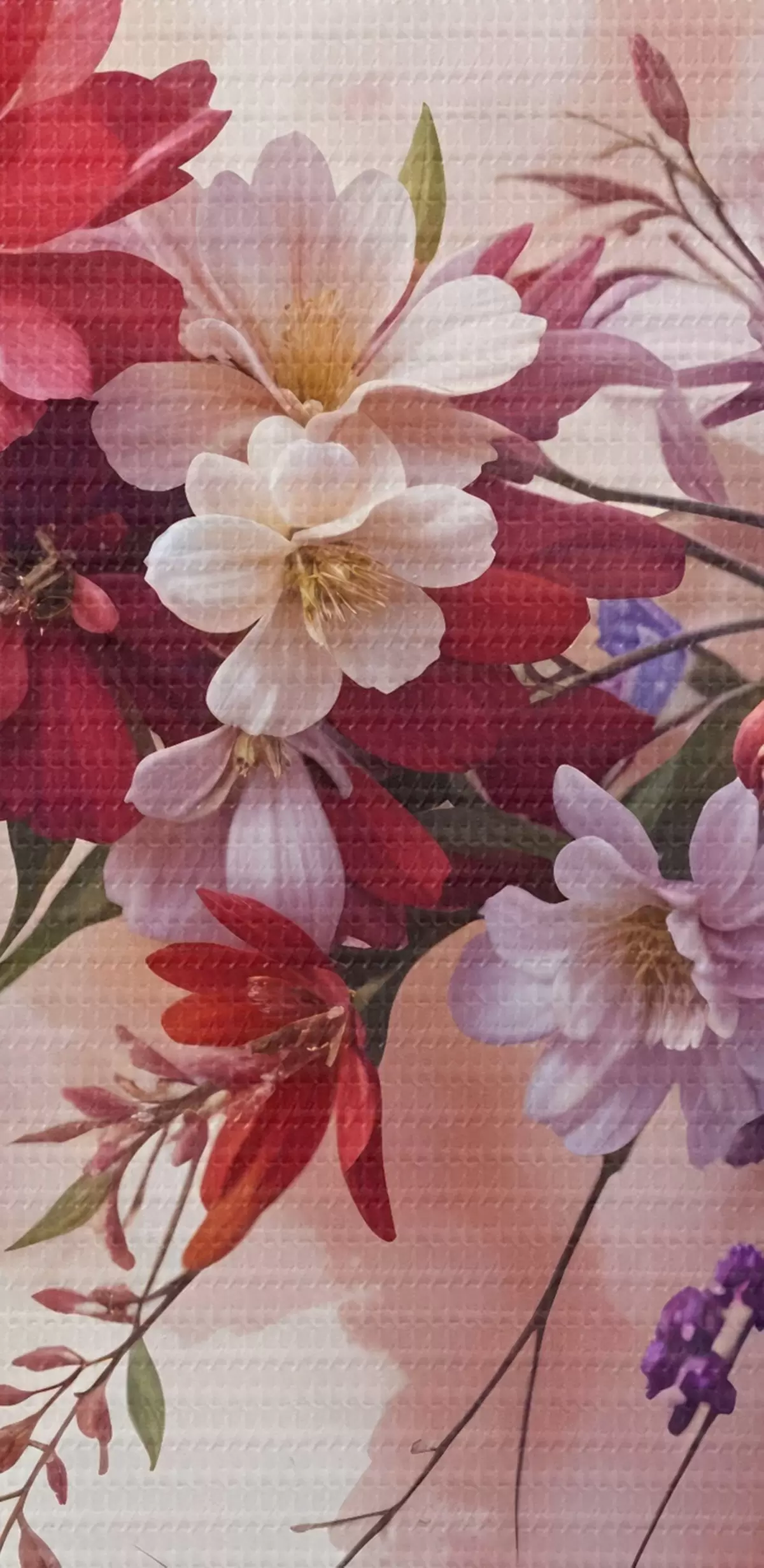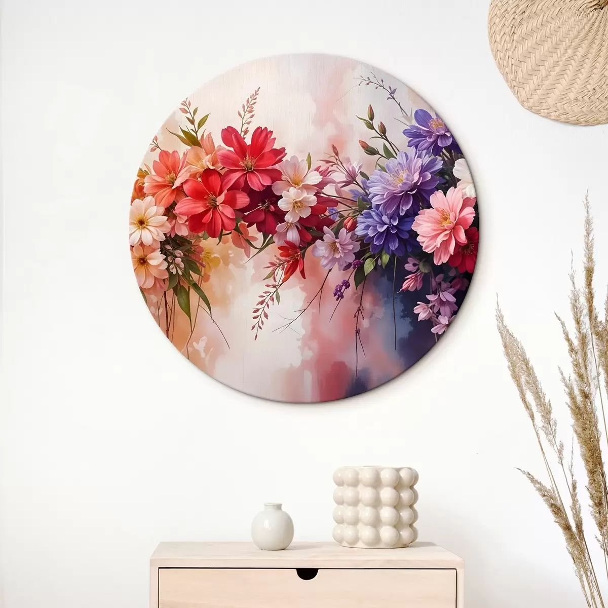 Runde Wandbilder Bunte Blumen, darunter rote, rosa und lila Dahlien, Gänseblümchen und andere Blüten vor einem weichen, unscharfen Hintergrund r42234