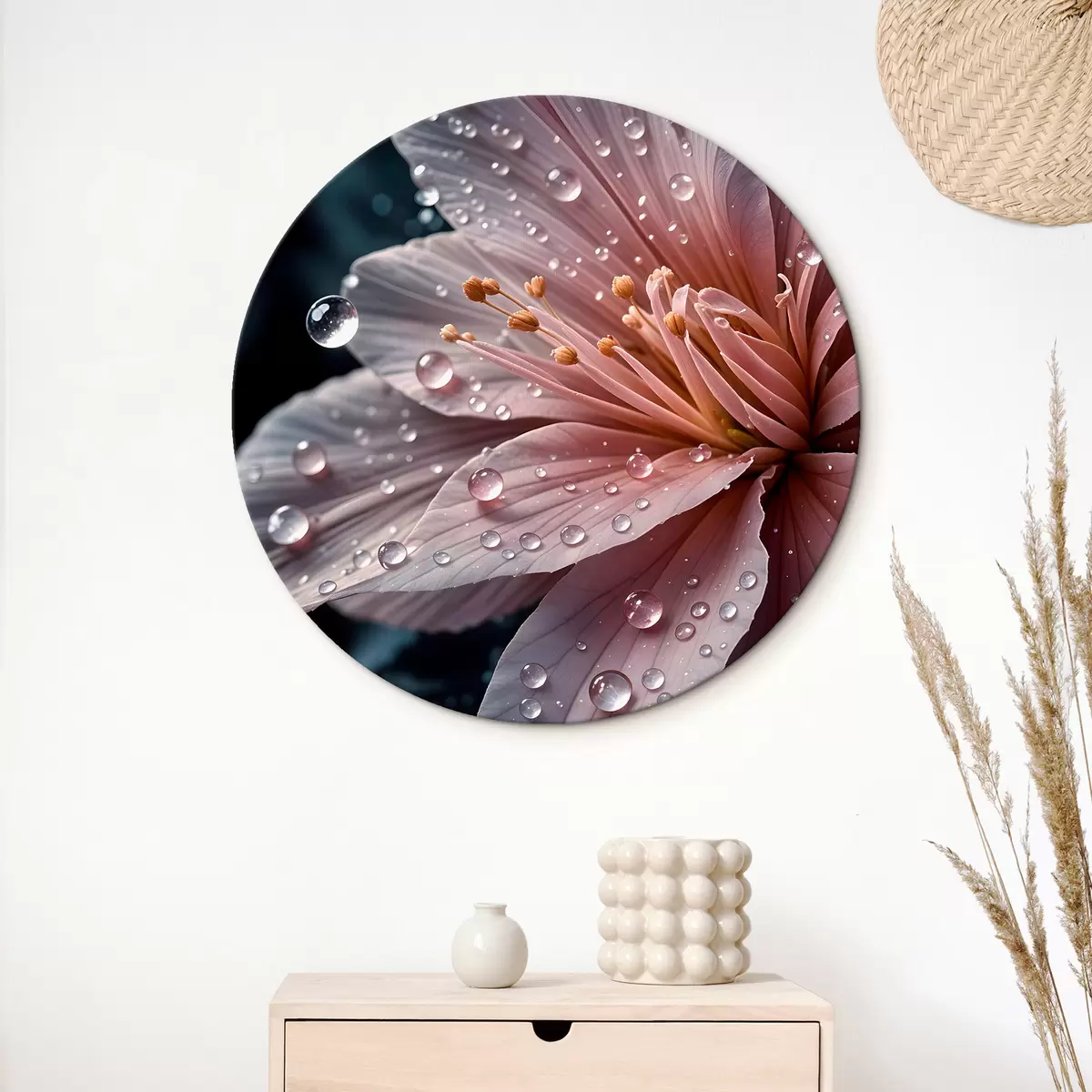 Runde Wandbilder Nahaufnahme einer rosafarbenen Blume mit zarten Blütenblättern, die mit Wassertropfen bedeckt sind, vor einem dunklen Hintergrund Nr r42237