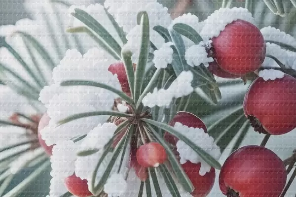 Runde Wandbilder Verschneiter Tannenzweig mit roten Beeren, Winterszene r42238