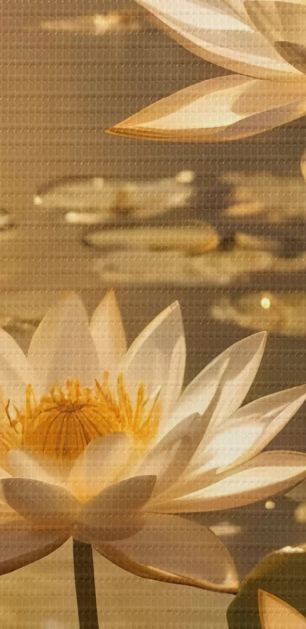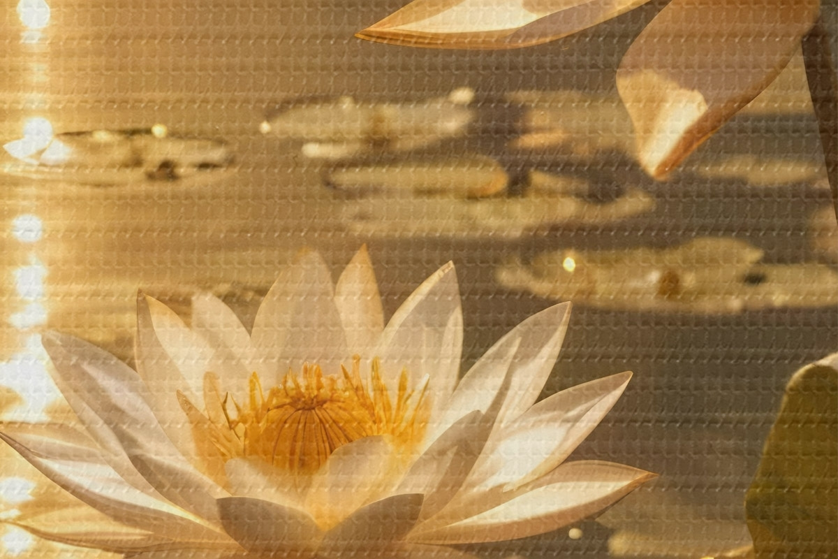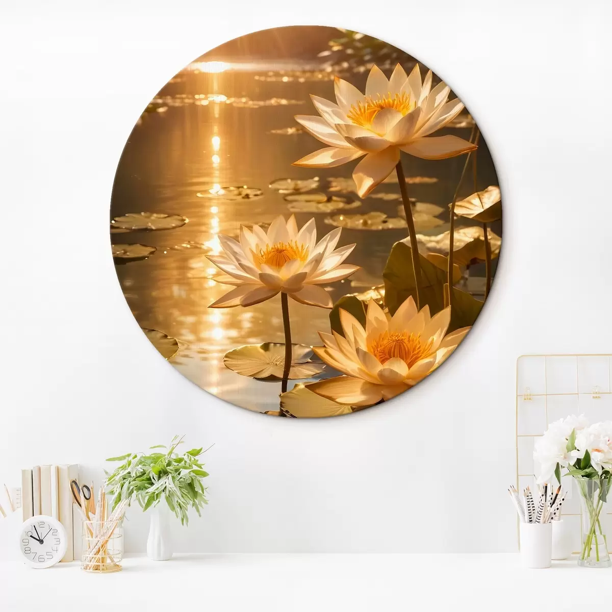 Runde Wandbilder Weiße Lotusblumen, die mit der Sonne auf einem ruhigen Teich schwimmen und eine heitere und ruhige Atmosphäre schaffen Nr r42239
