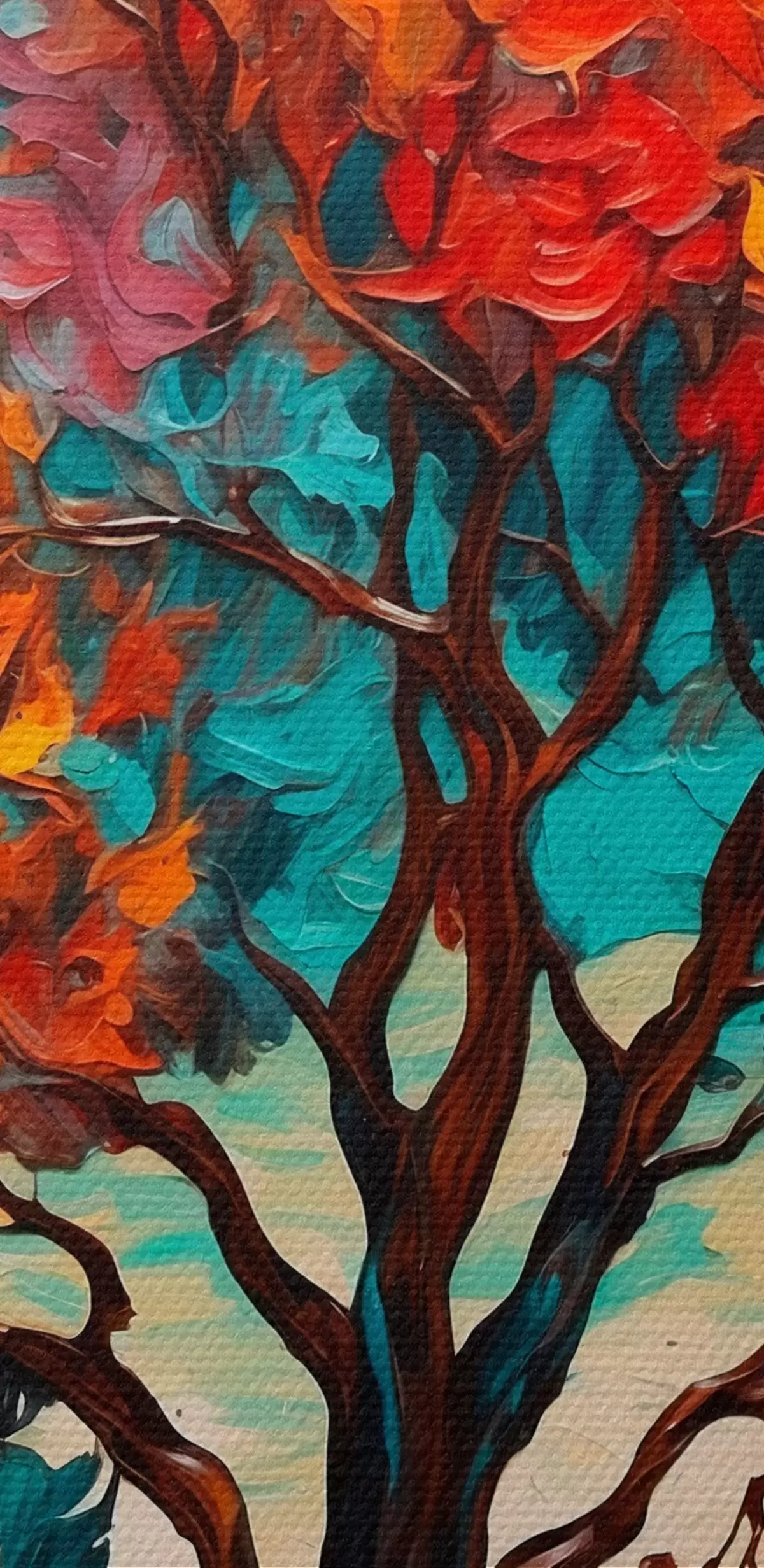 Runde Wandbilder Baum auf orange-blauem Hintergrund im Stil der Ölmalerei r42267