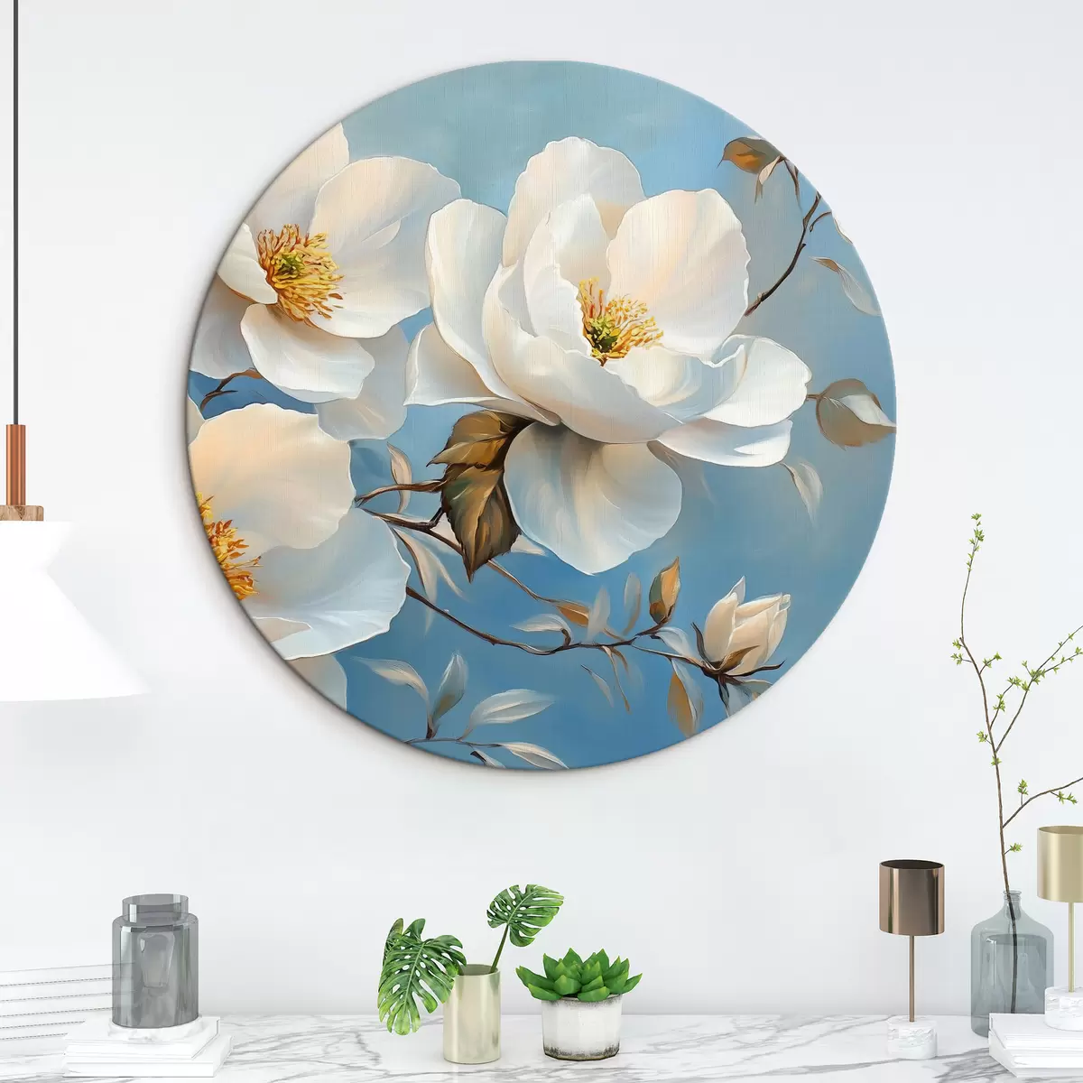 Runde Wandbilder Große weiße Blumen auf blauem Hintergrund r42321