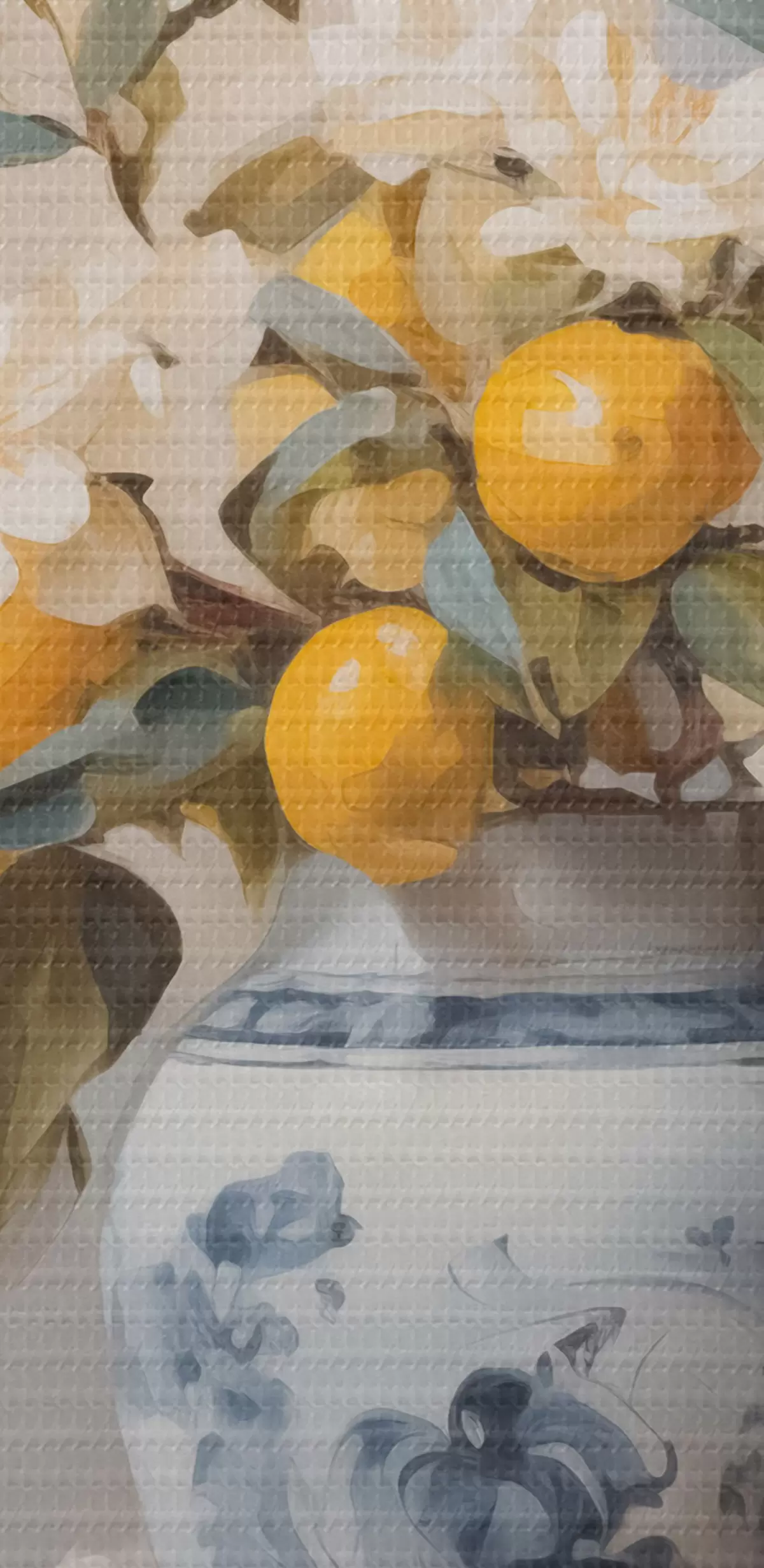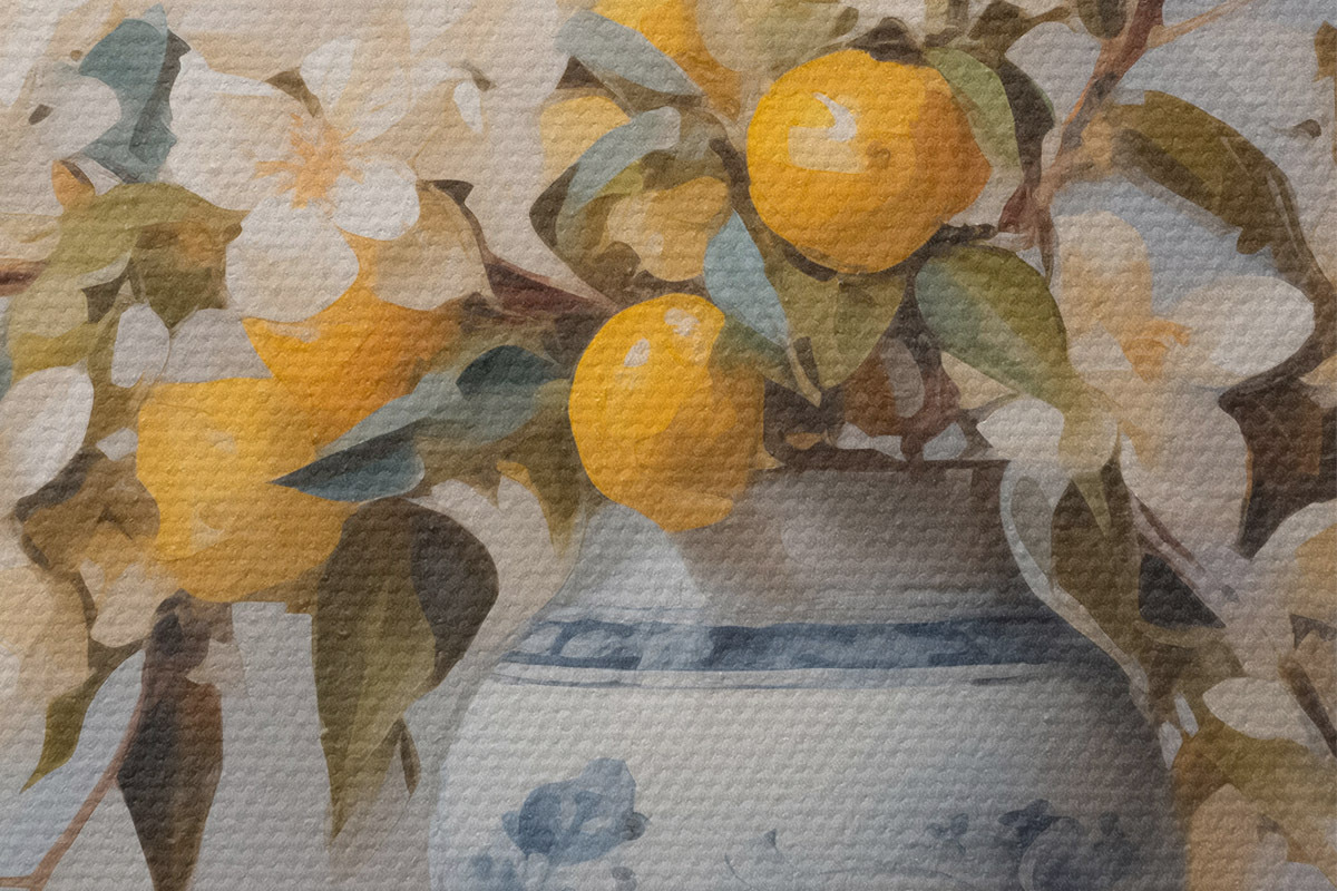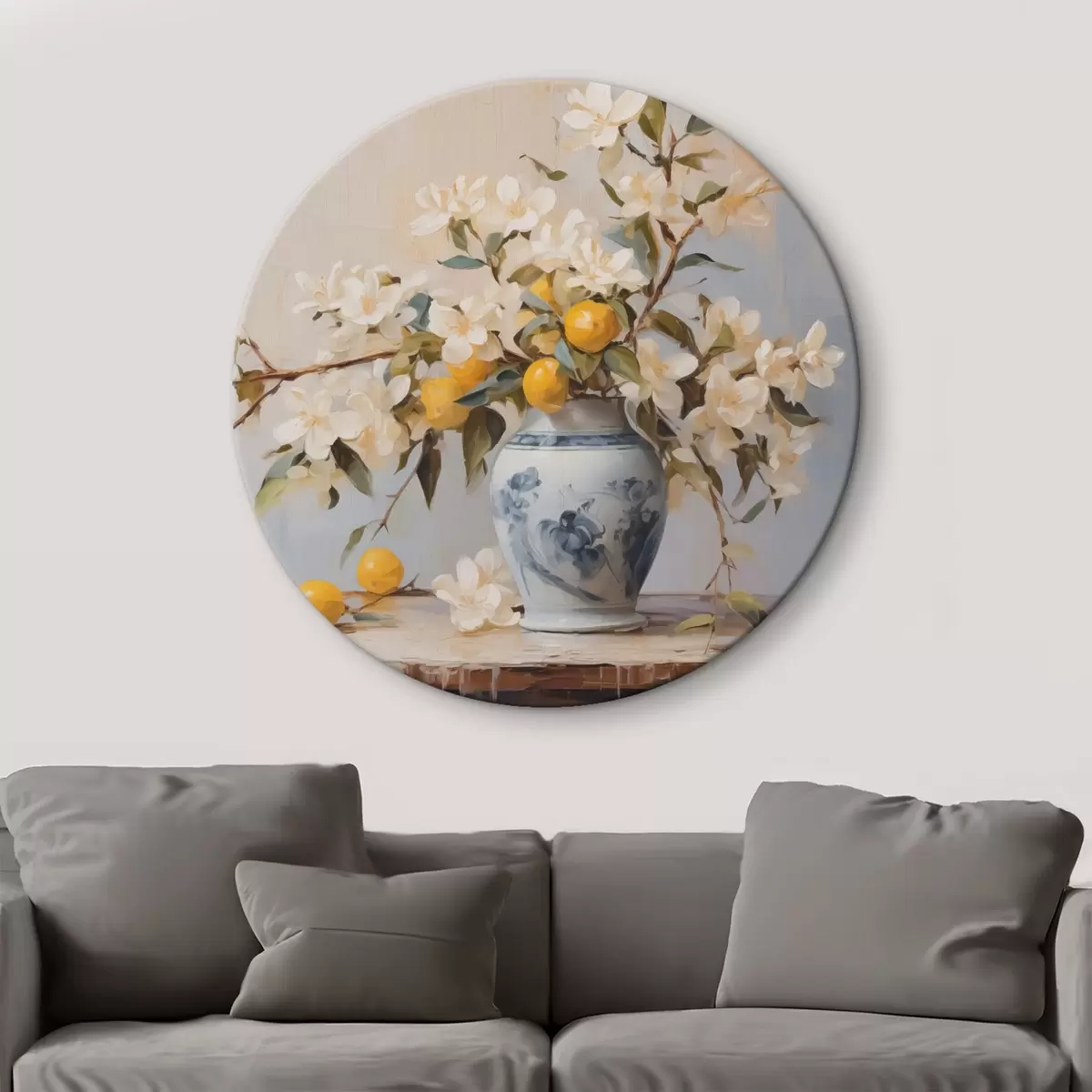 Runde Wandbilder Vase mit Zweigen von weißen Blumen und Zitronenimitation Malerei r42360