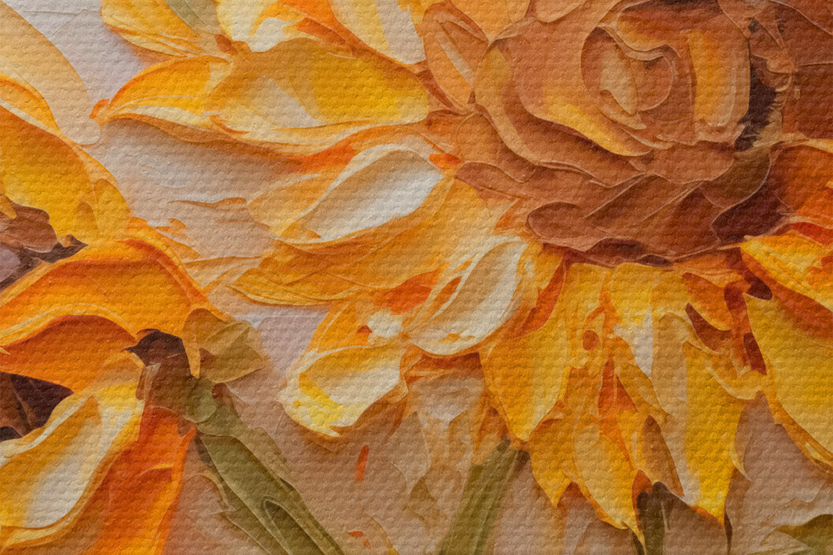 Drei Materialtypen stehen zur Verfügung: Economic Canvas - ein dichtes und haltbares Material für den Digitaldruck, identisch mit Malerleinwand, wasserfeste Oberfläche, realistische Wiedergabe von Details, mittelkörniges Material. Premium Canvas - die Textur ähnelt der einer Malerleinwand (verwobene kleine Fäden). Weiche, detaillierte Wiedergabe des Bildes auf einer matten Oberfläche. Eco-Premium - hochwertiges Gewebe aus 100% Baumwolle. Dank der natürlichen Baumwollfasern ist das Material langlebig und verschleißfest. Hervorragende Farbwiedergabe und Detailtreue.