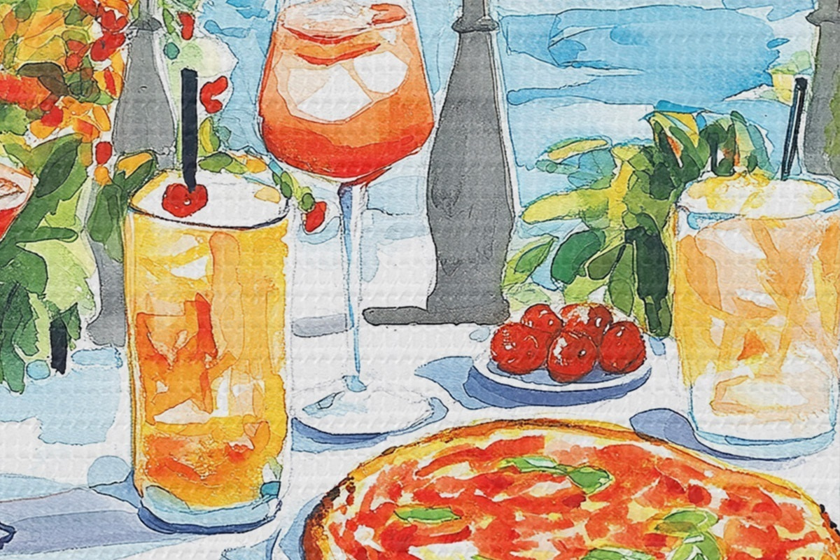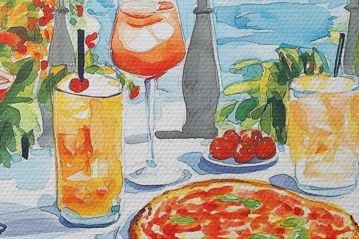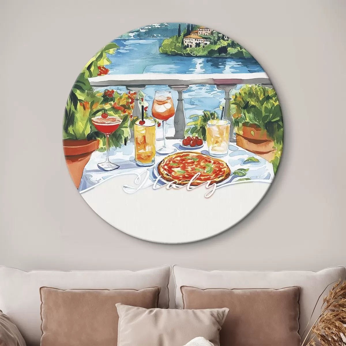 Runde Wandbilder Italien Ästhetik, Aquarellstil, Pizza und Cocktails, Berge r42434