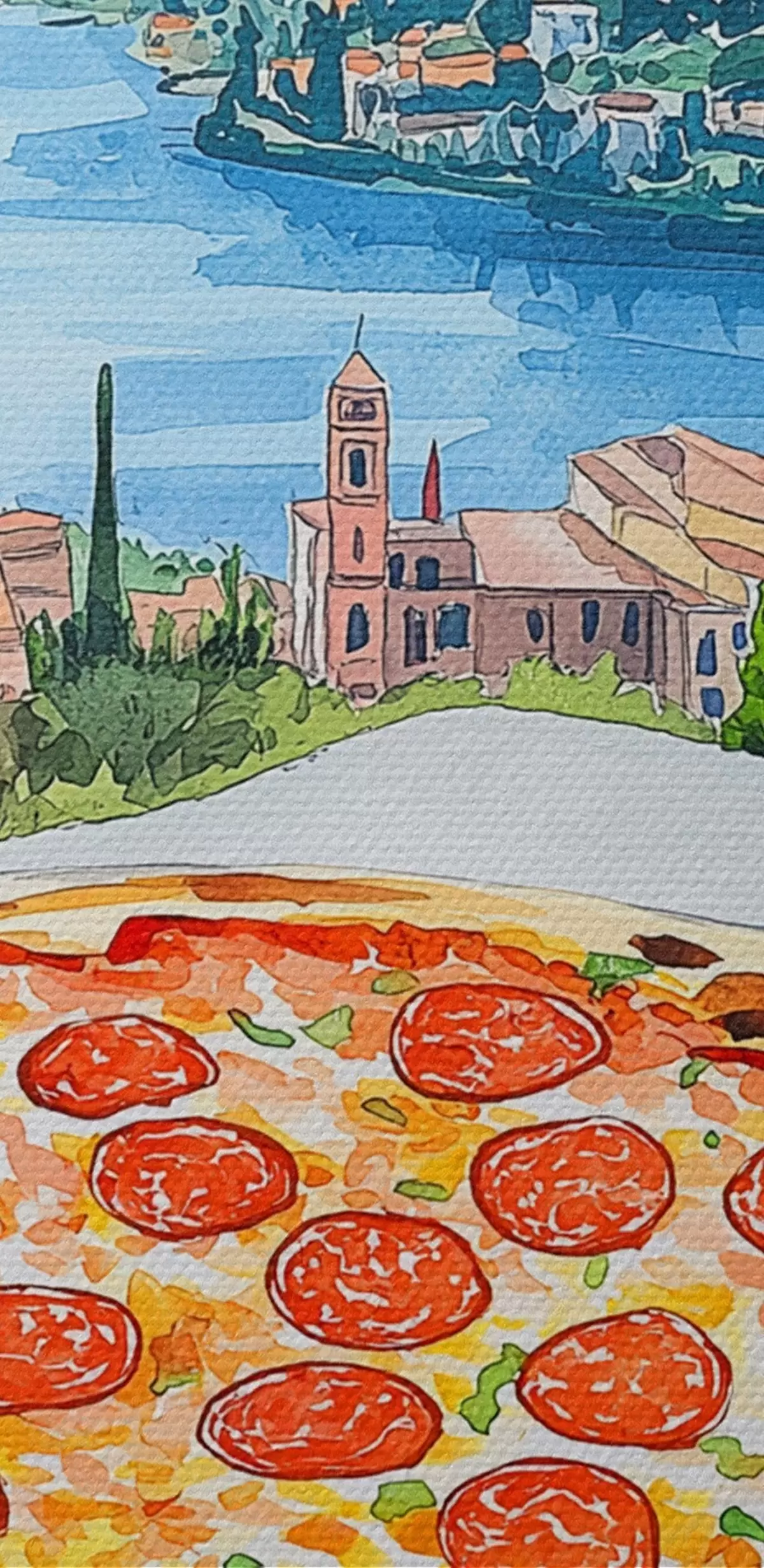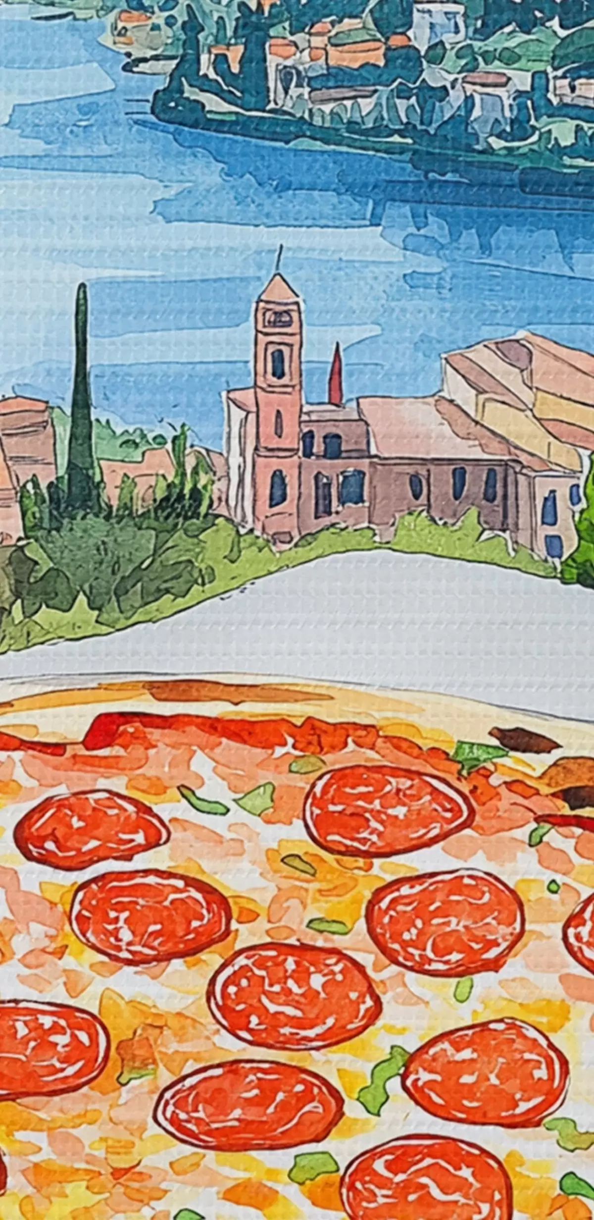 Runde Wandbilder Aquarell-Stil, Italien, Pizza, alte Stadt, Berge Landschaft Nr r42435