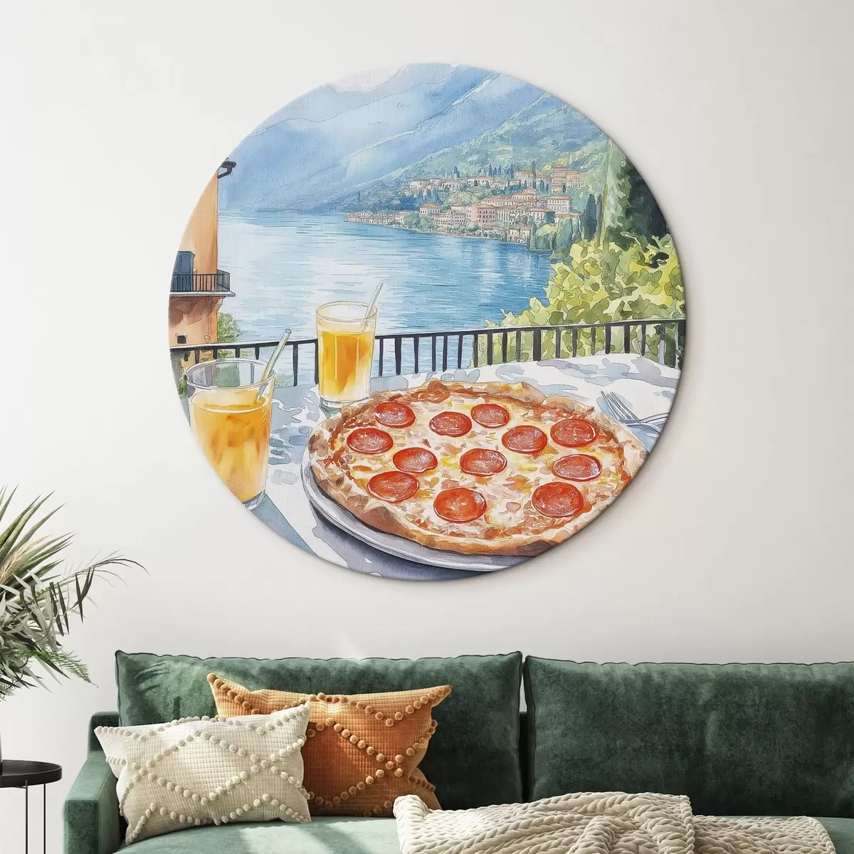 Runde Wandbilder Brunch in Italien, Aquarellstil, Pizza Margarita, See, Sommer Natur r42436