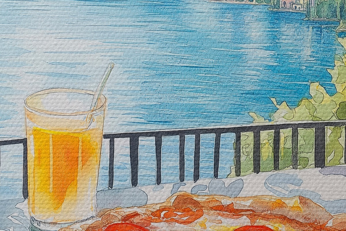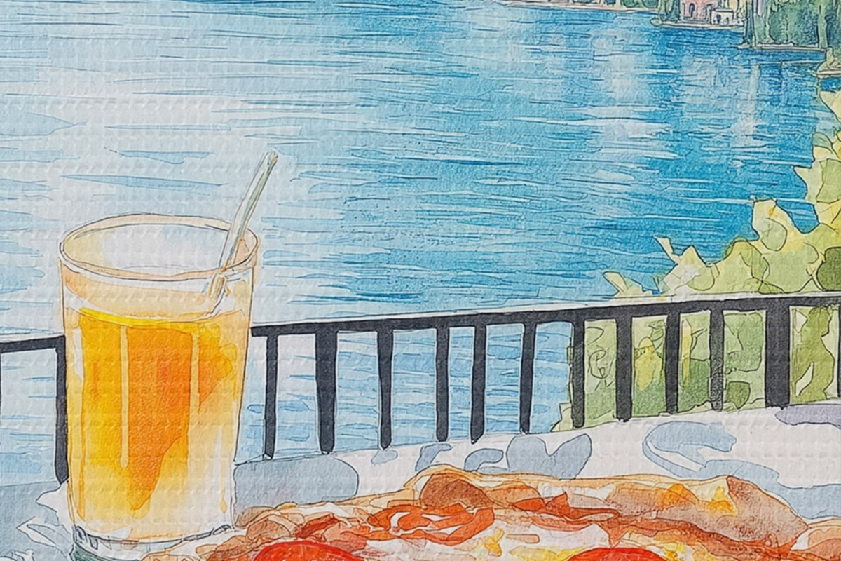 Runde Wandbilder Brunch in Italien, Aquarellstil, Pizza Margarita, See, Sommer Natur Nr r42436