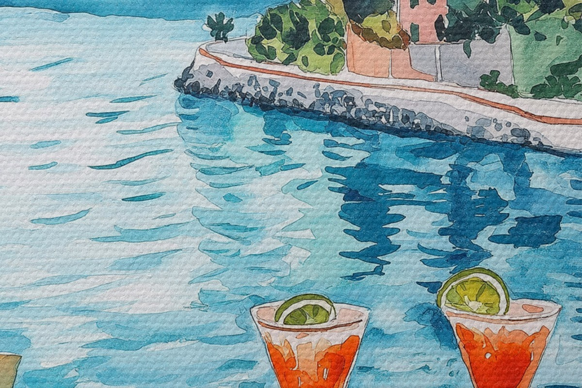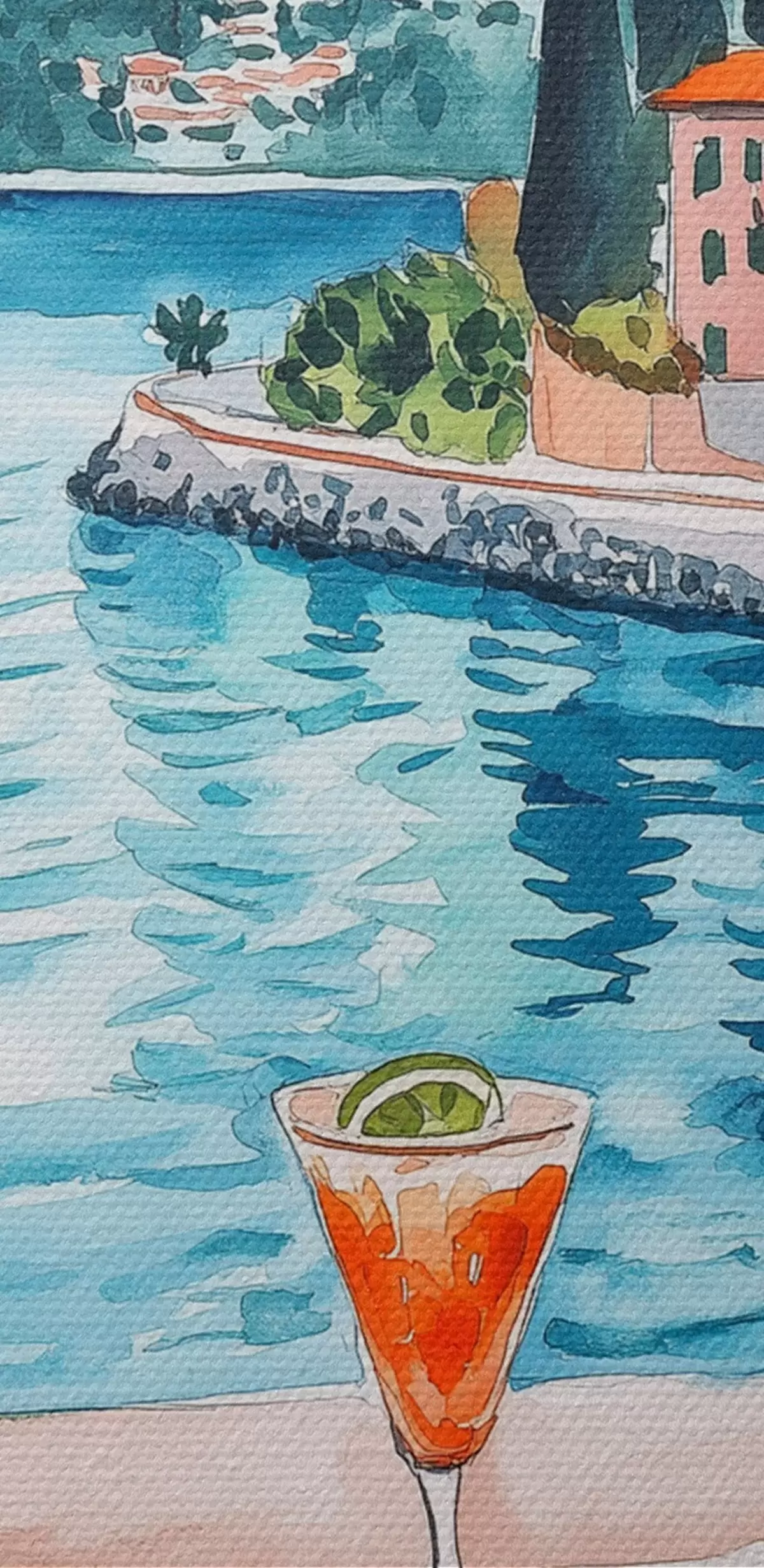 Runde Wandbilder Comer See, Italien, Aquarellstil, Pizza, Cocktails, Altstadt, Berge r42437