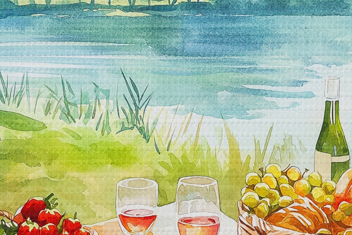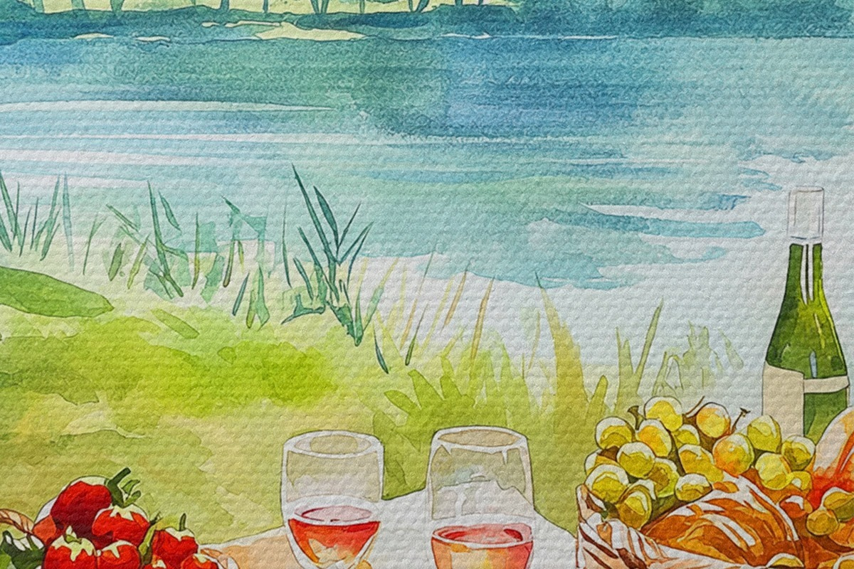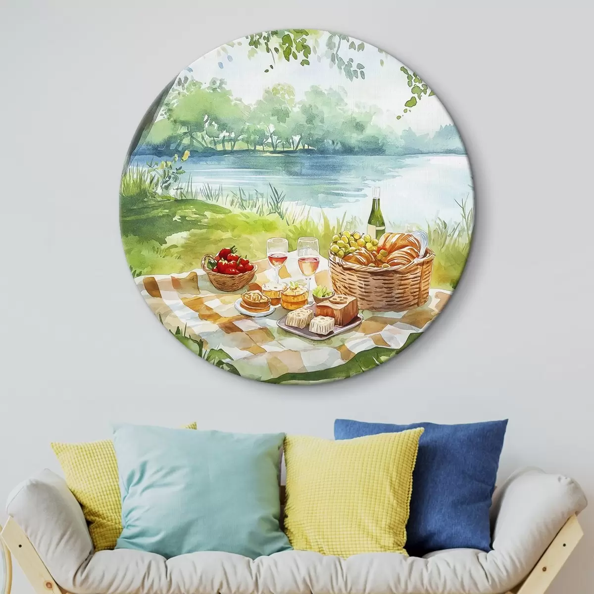 Runde Wandbilder Picknick-Ästhetik, Sommer Natur, See, romantisch, Aquarell-Stil r42450