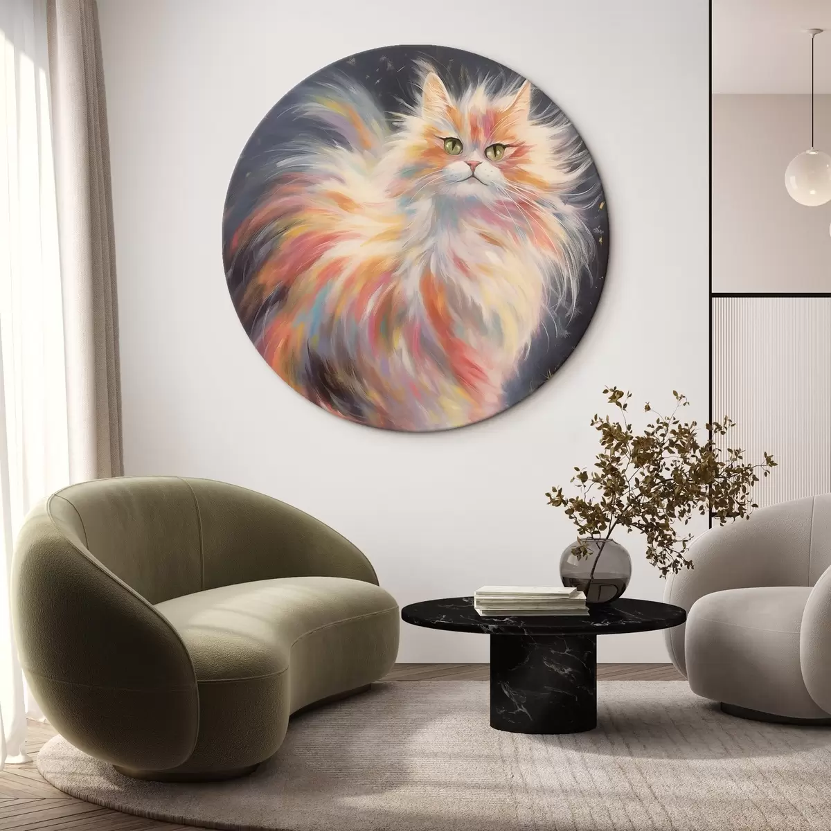 Runde Wandbilder Flauschige Katze mit buntem Fell auf dunklem Hintergrund Nr r42484