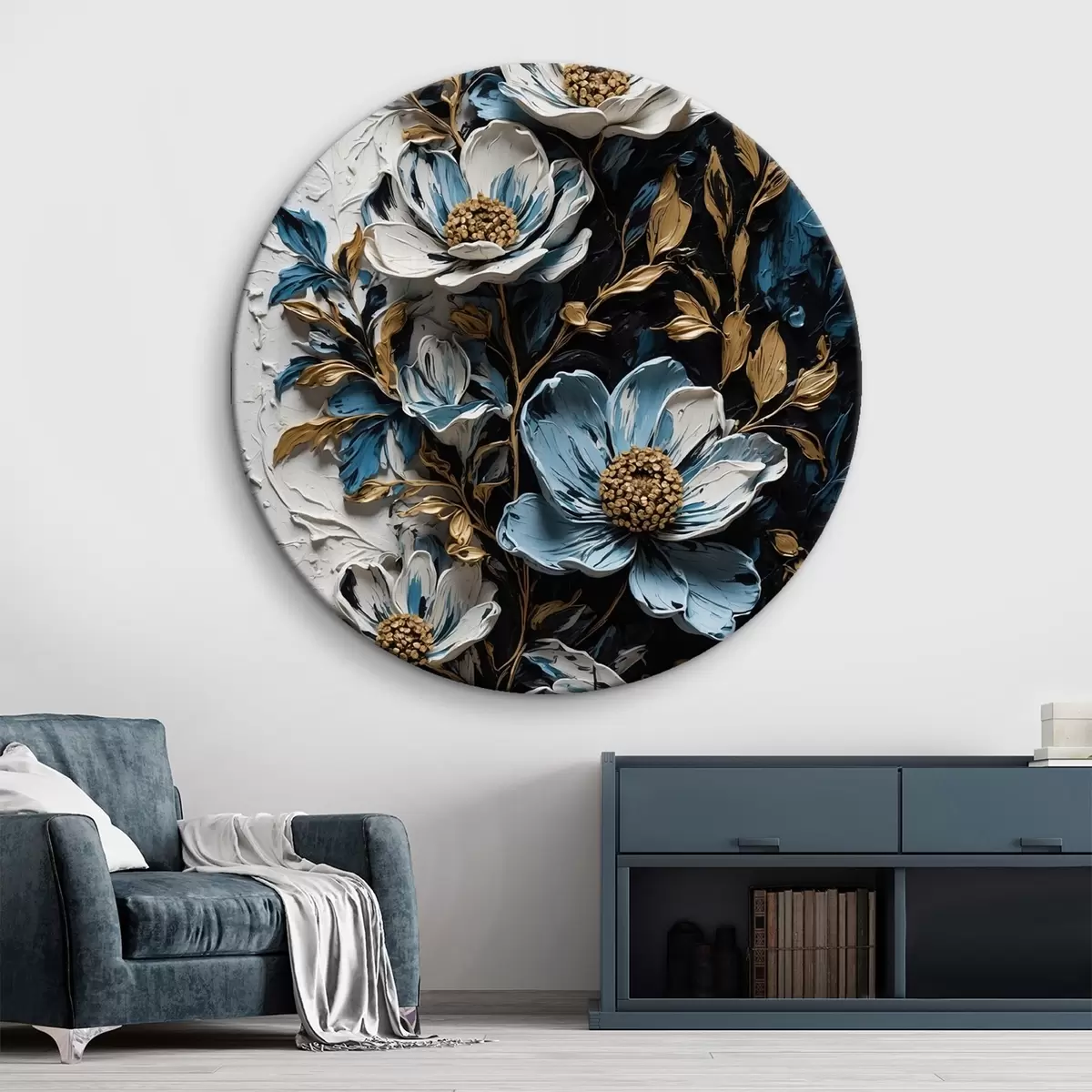 Runde Wandbilder Blumen und Stängel auf schwarzem und weißem Hintergrund im Stil der Ölmalerei r42532