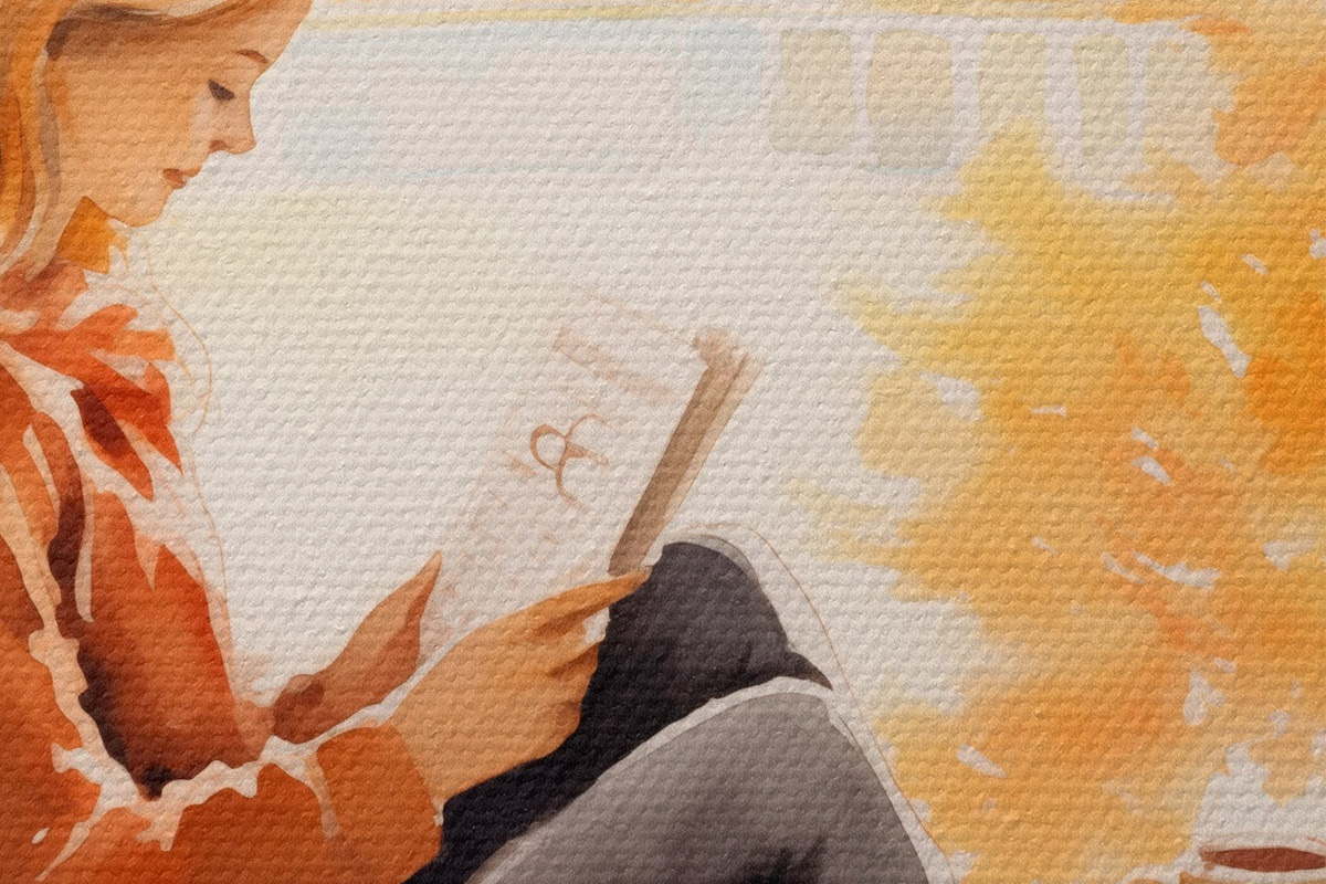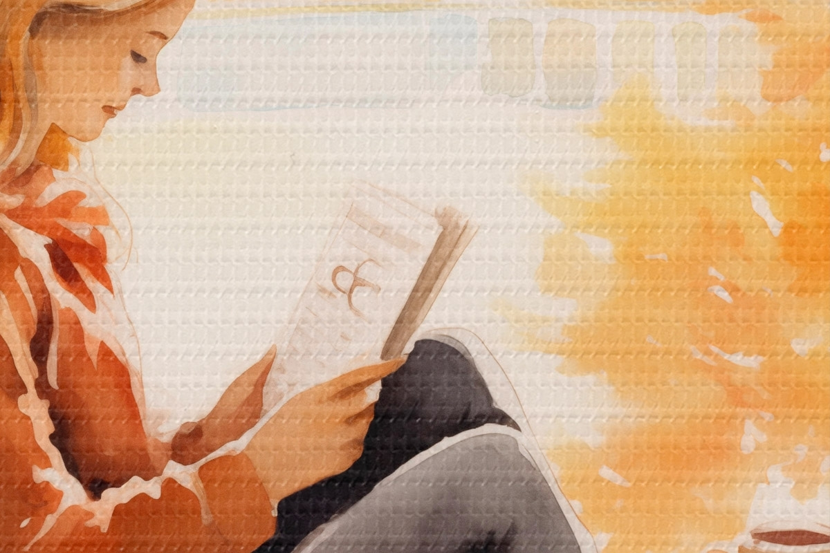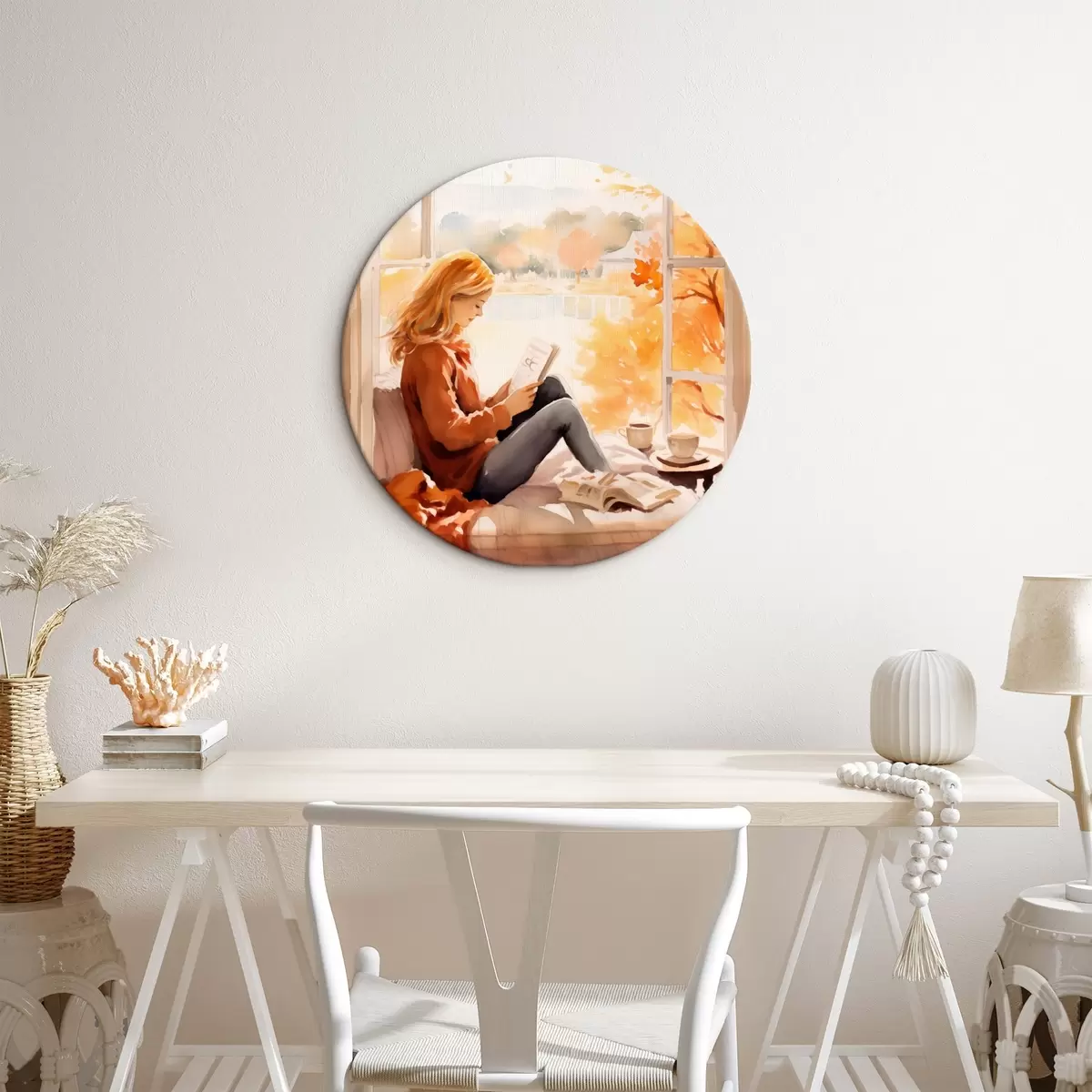 Runde Wandbilder Ein Mädchen liest ein Buch an einem offenen Fenster in einer herbstlichen Umgebung, mit hellen, goldenen Bäumen im Hintergrund und einer Tasse Tee in der Nähe. r42572