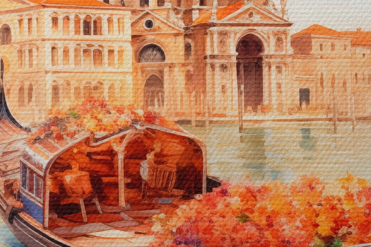 Runde Wandbilder Eine herbstliche Ansicht von Venedig mit einer Gondel, umgeben von leuchtend orangefarbenen und roten Blättern, mit Spiegelungen von Gebäuden im ruhigen Wasser des Kanals. r42576