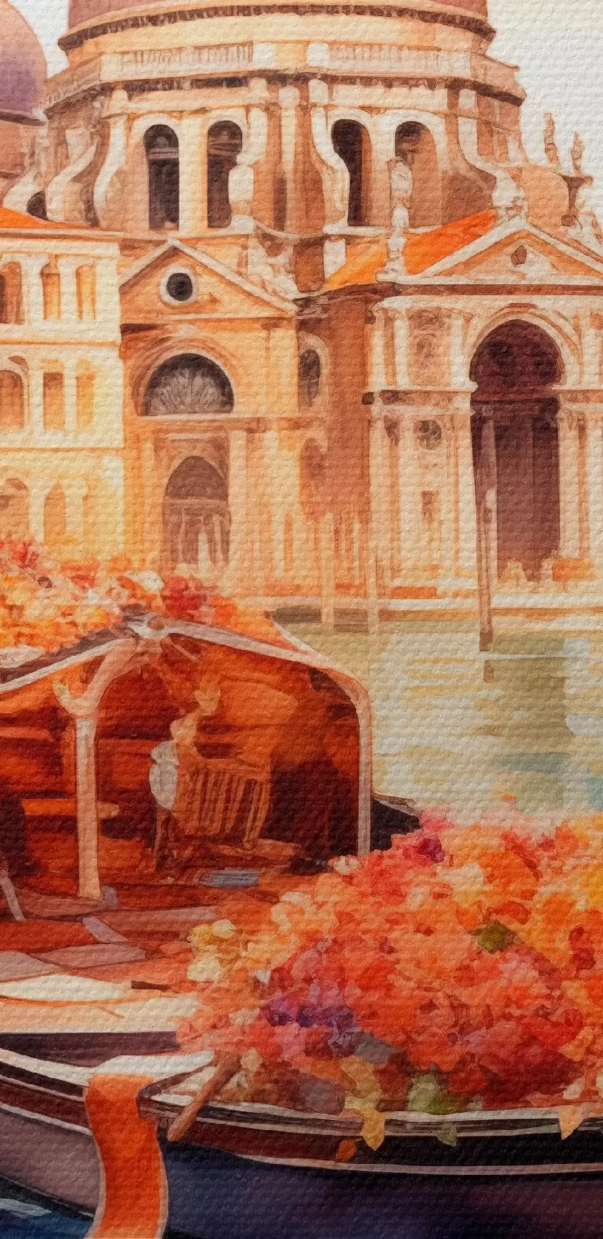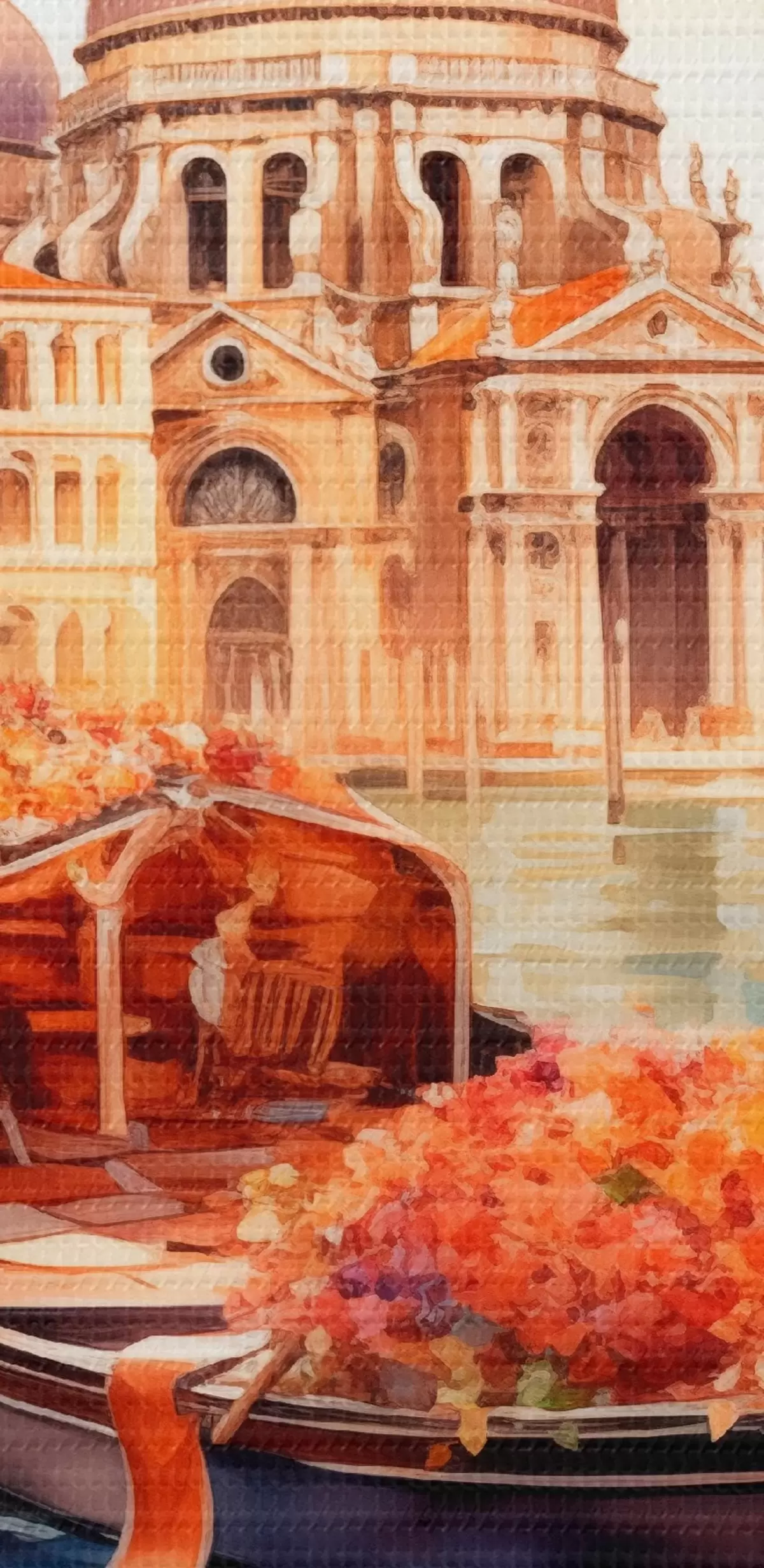 Runde Wandbilder Eine herbstliche Ansicht von Venedig mit einer Gondel, umgeben von leuchtend orangefarbenen und roten Blättern, mit Spiegelungen von Gebäuden im ruhigen Wasser des Kanals r42576