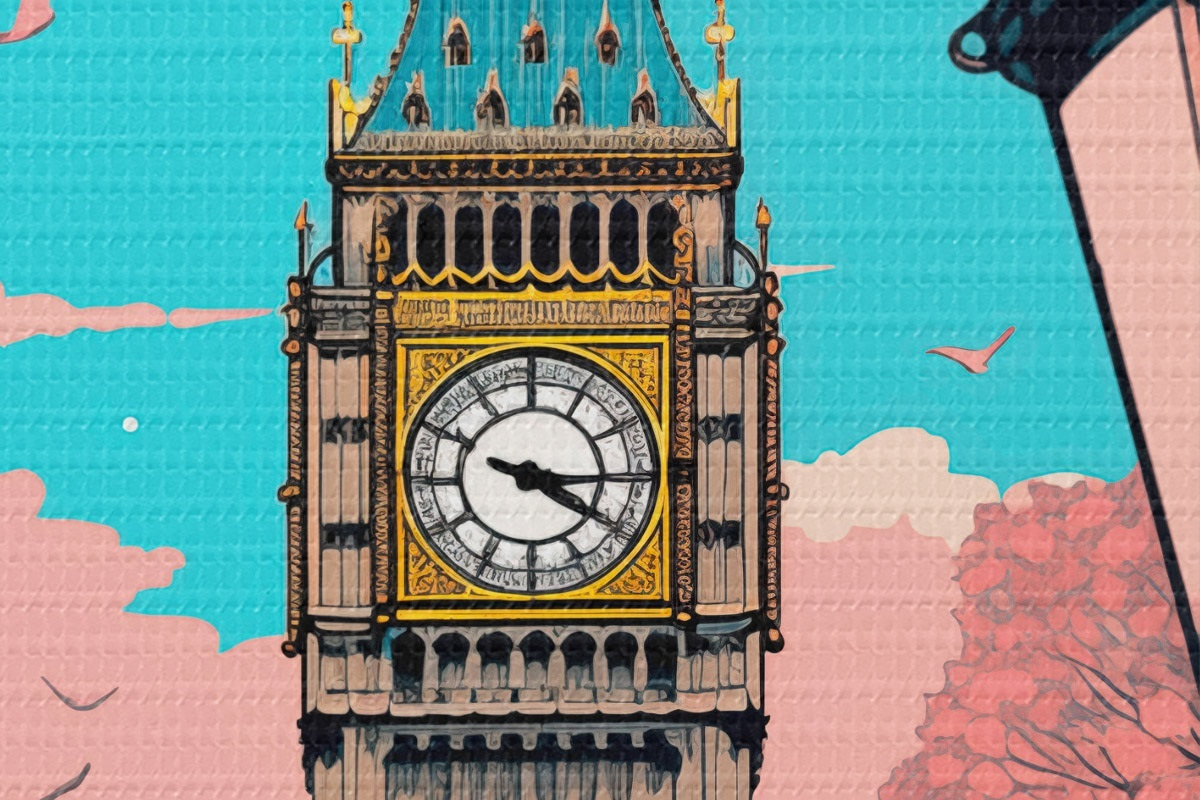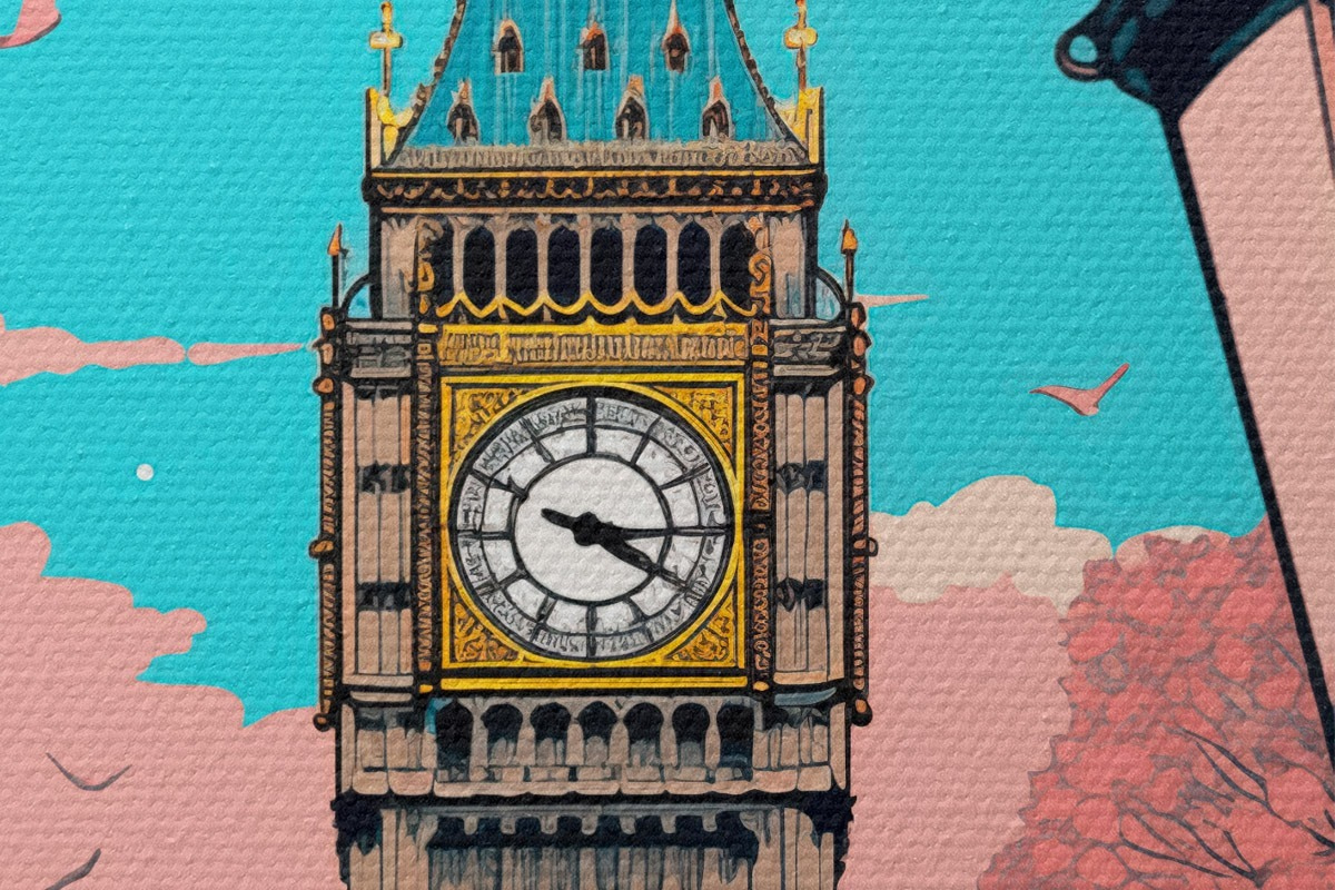 Runde Wandbilder Eine Ansicht von Big Ben mit frühlingshaften rosa Bäumen, einem strahlend blauen Himmel und einer alten Straßenlaterne im Vordergrund Nr r42578