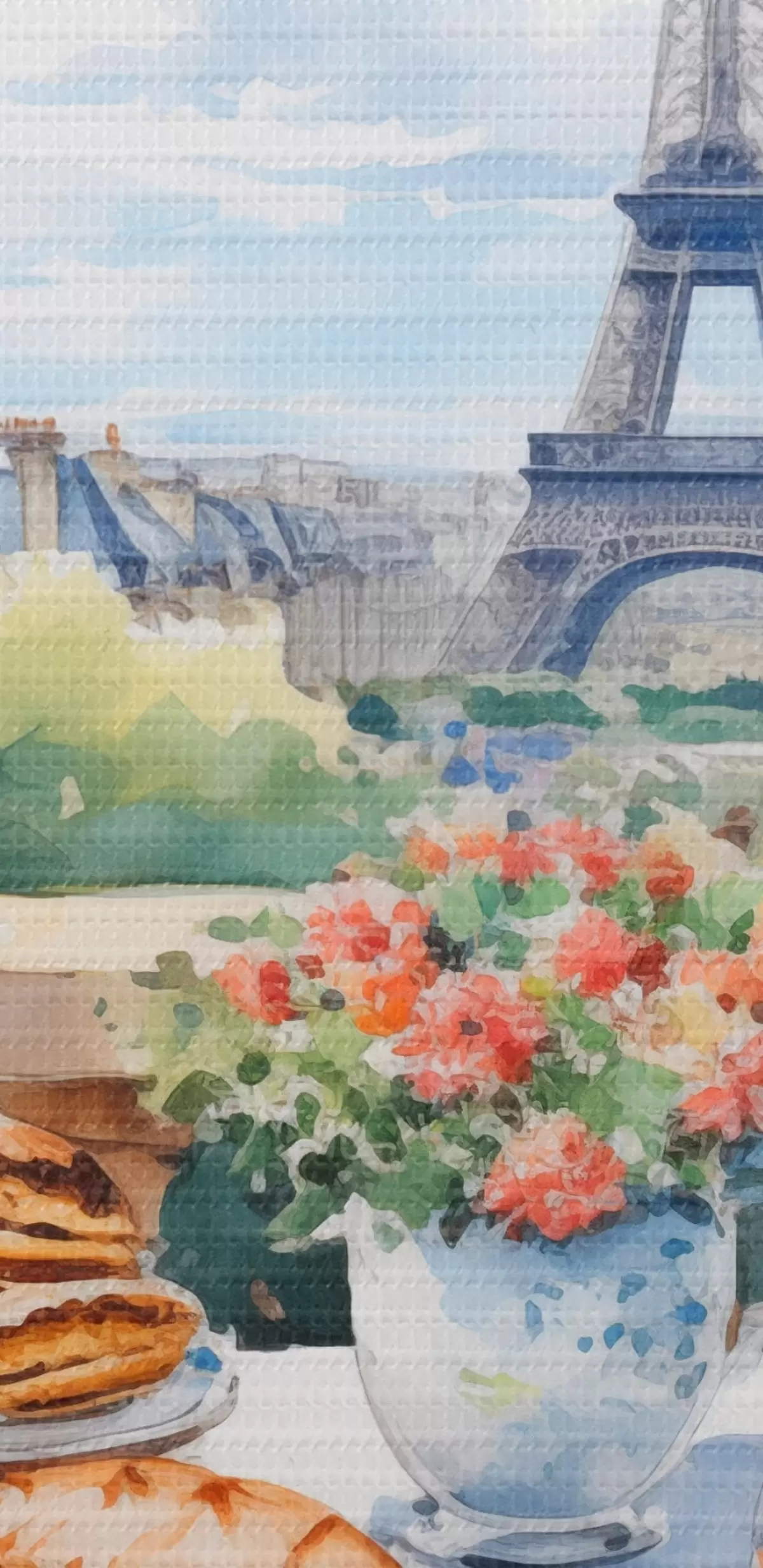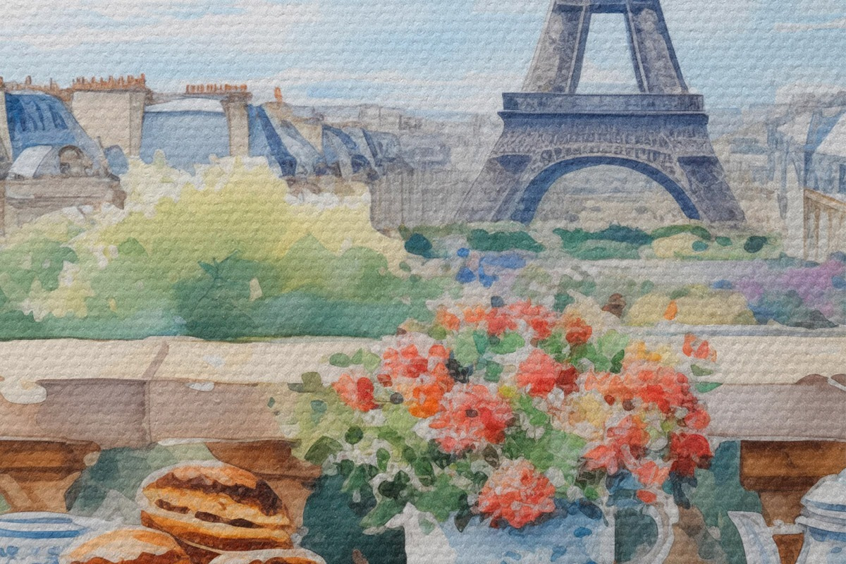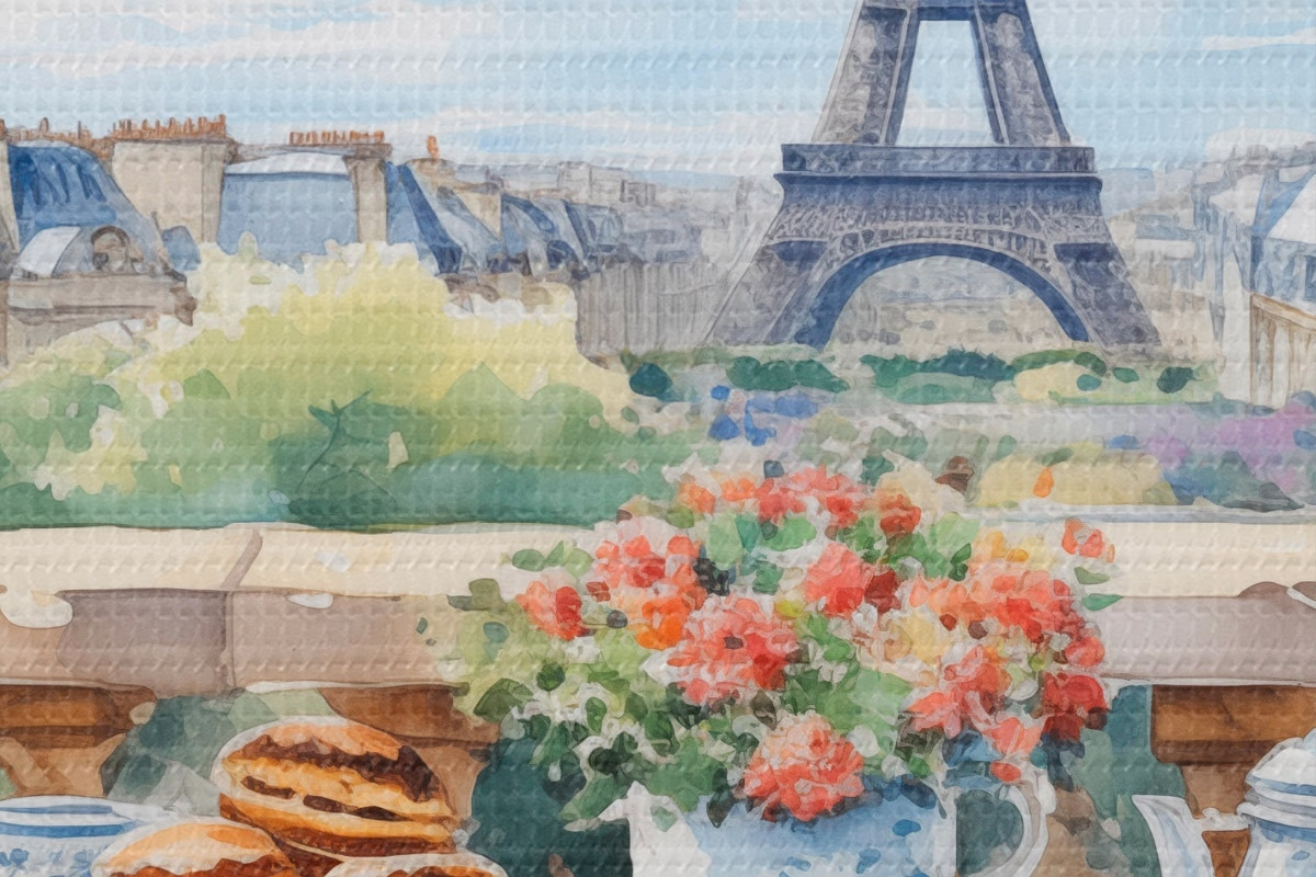 Runde Wandbilder Ein romantischer Blick auf den Eiffelturm von einem Balkon mit einem gedeckten Tisch mit Desserts, Tee und Blumen in einer sommerlichen Atmosphäre. Nr r42579