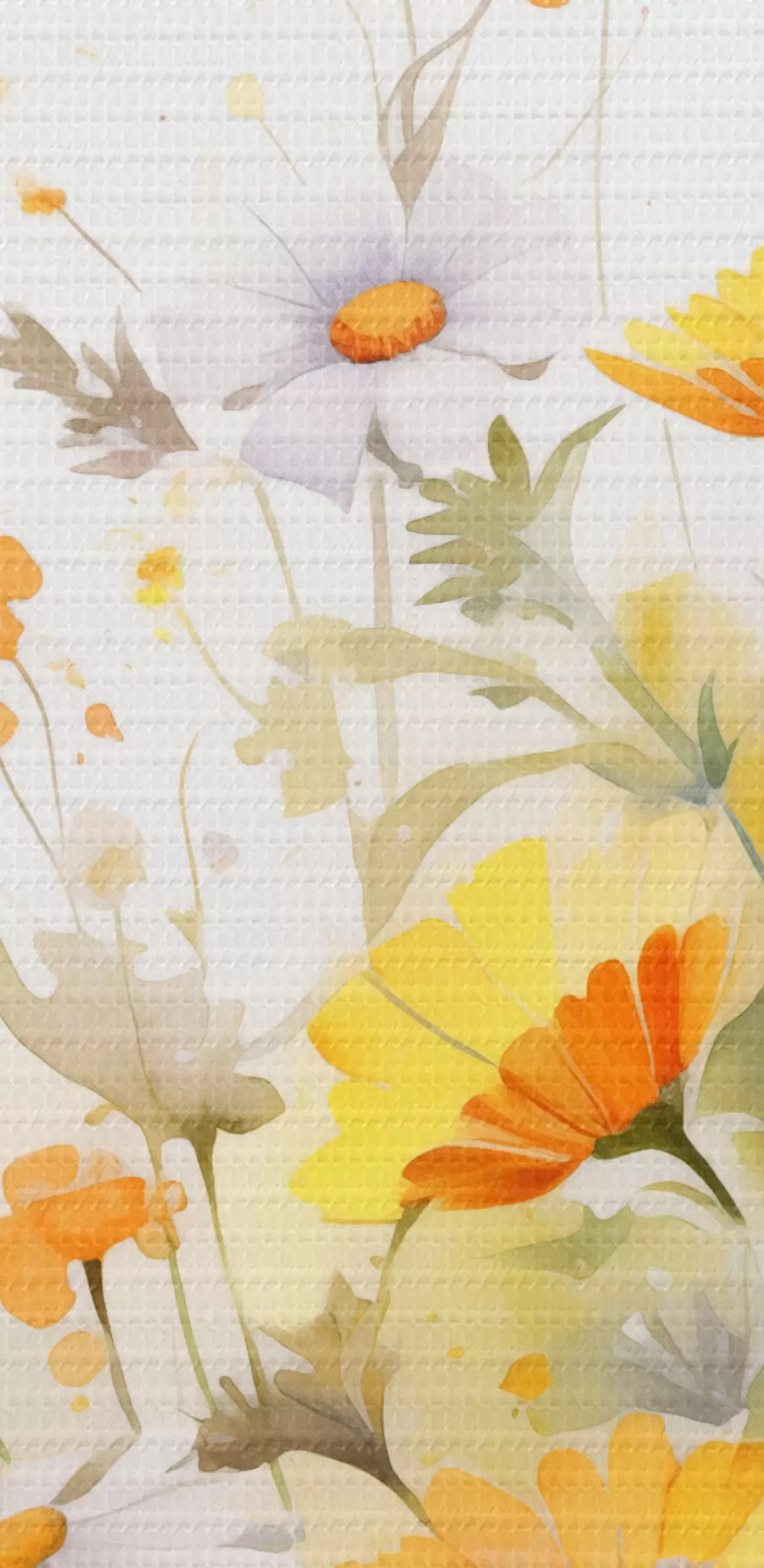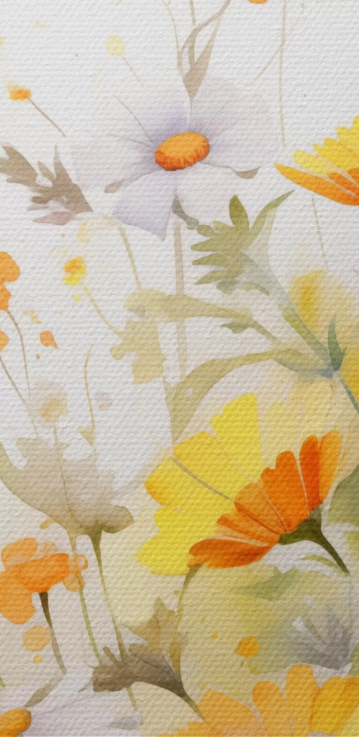 Runde Wandbilder Ein leuchtendes, aquarellartiges Blumenfeld mit orangefarbenen und weißen Gänseblümchen, in dessen Nähe ein Schmetterling flattert r42714