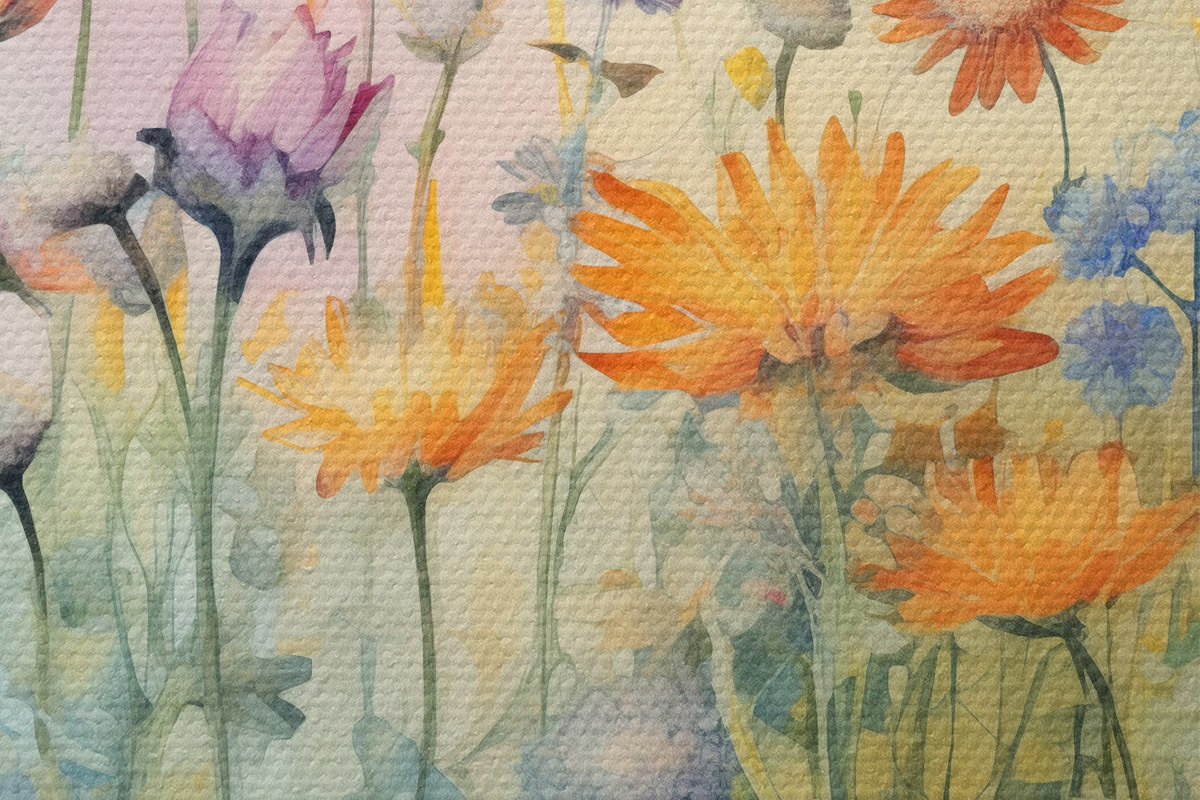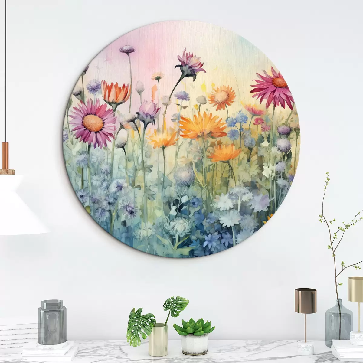 Runde Wandbilder Ein lebhaftes Feld hoher und üppiger Wildblumen vor einem weichen, pastellfarbenen, aquarellartigen Hintergrund Nr r42726