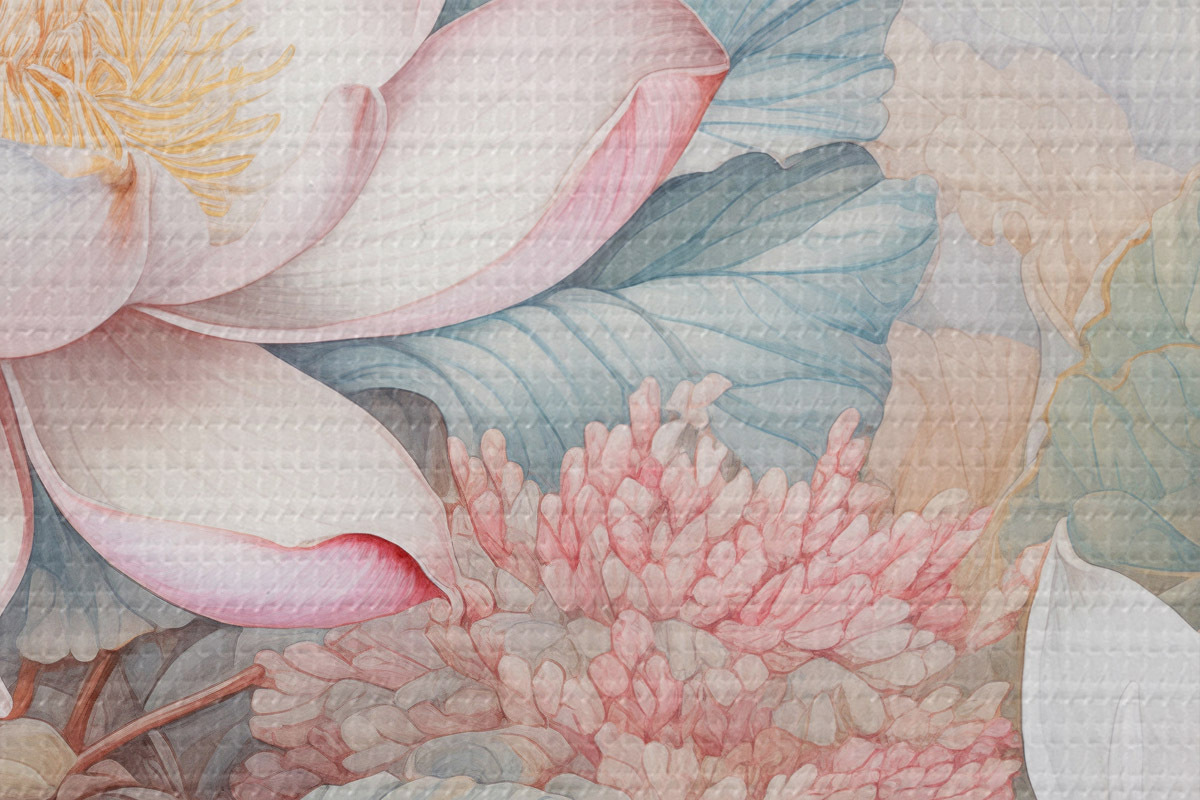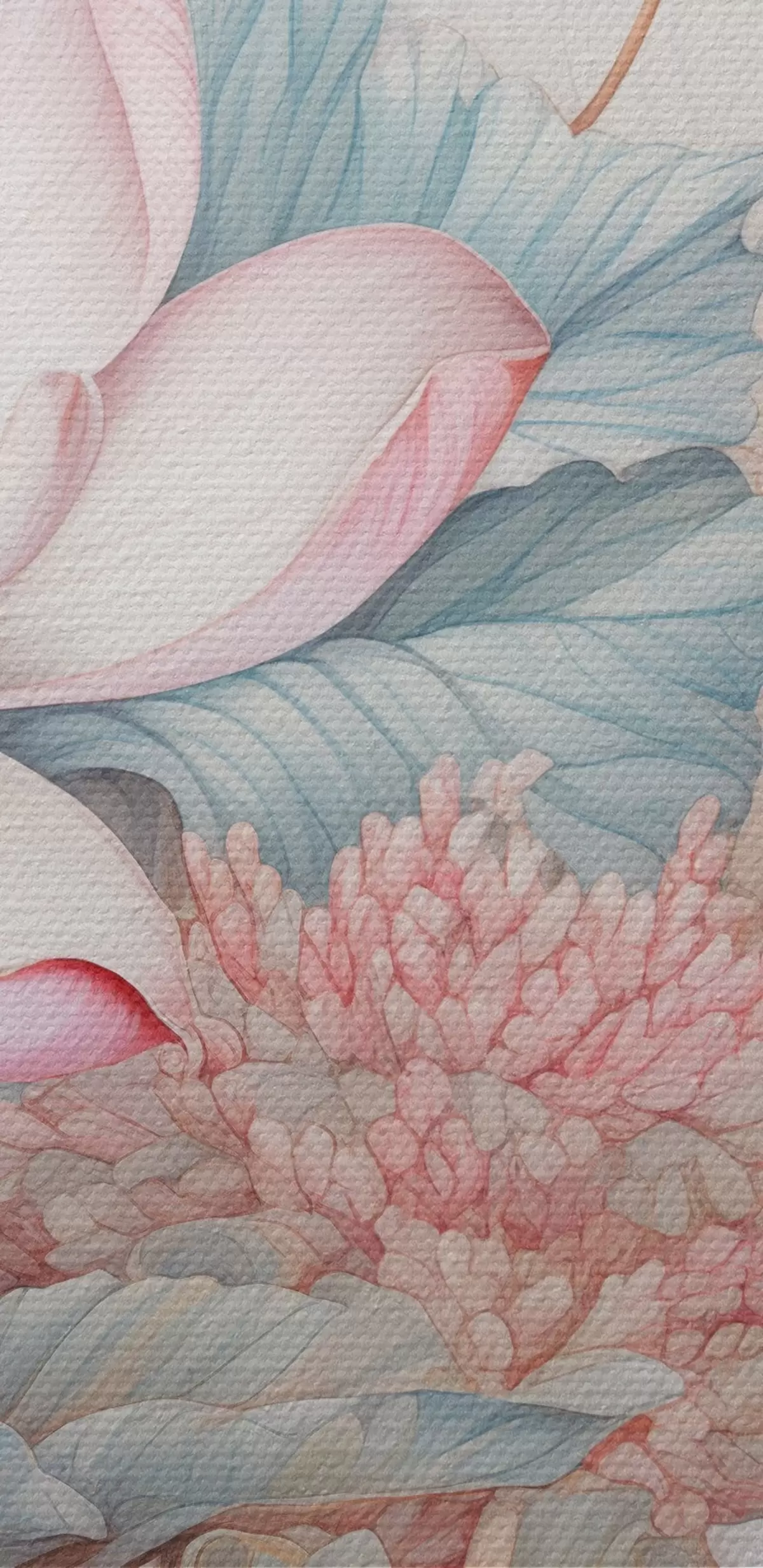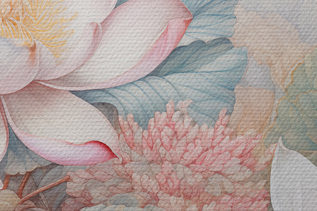 Runde Wandbilder Große, blühende Lotosblüten in zarten Rosa- und Weißtönen, umgeben von grünen Blättern und zartrosa Laub Nr r42729