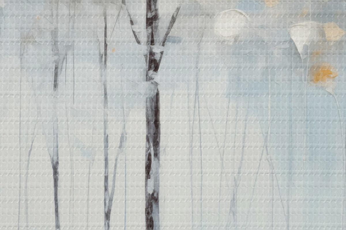 Runde Wandbilder Hohe, schlanke Bäume mit blauen Blättern und einem Hauch von Gelb auf einem weichen blauen Hintergrund, Ölgemälde-Imitation r42731