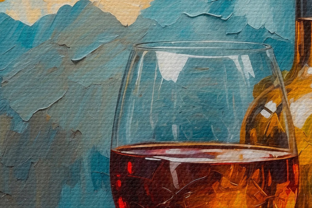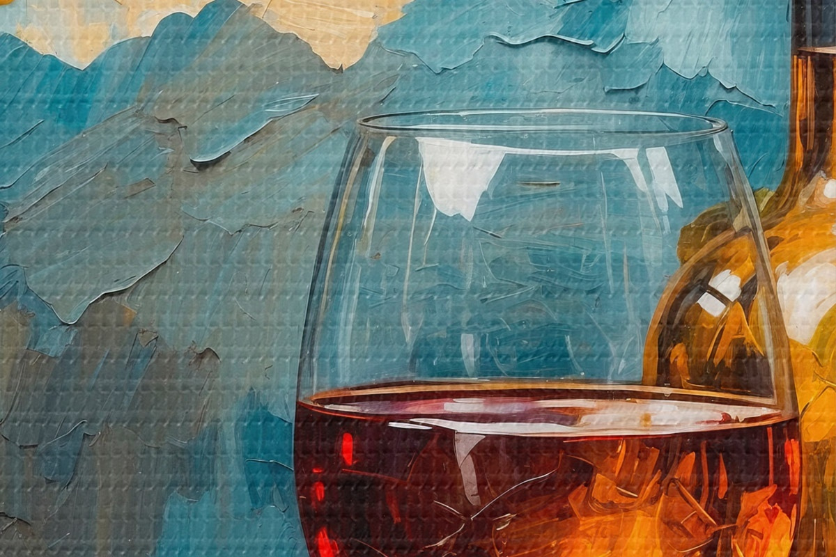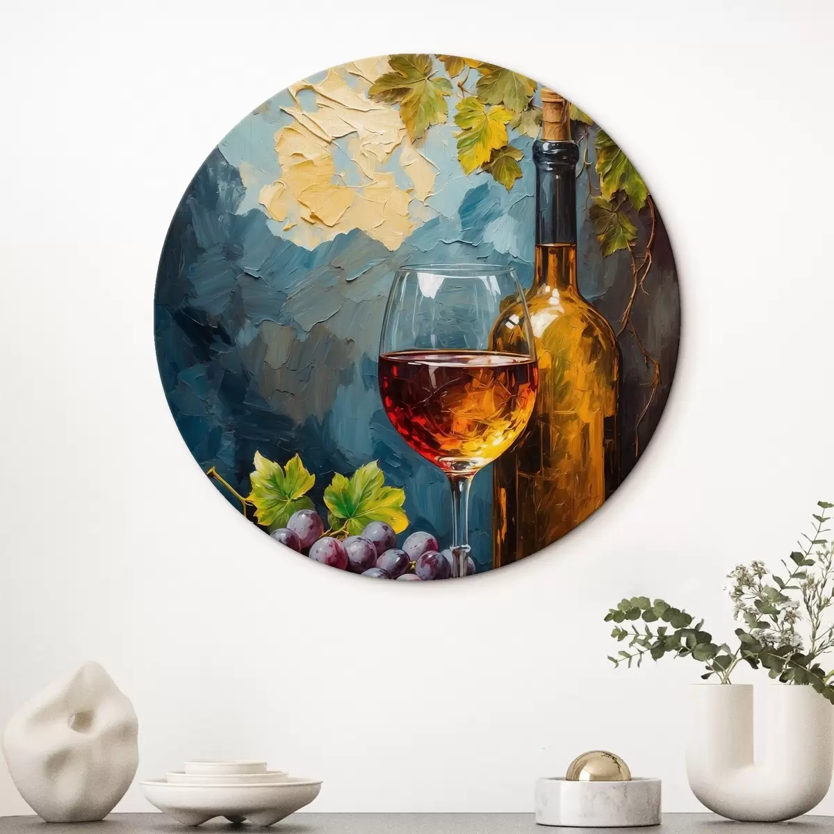 Runde Wandbilder Trauben, Glas und Weinflasche auf abstraktem Acryl-Hintergrund r42772