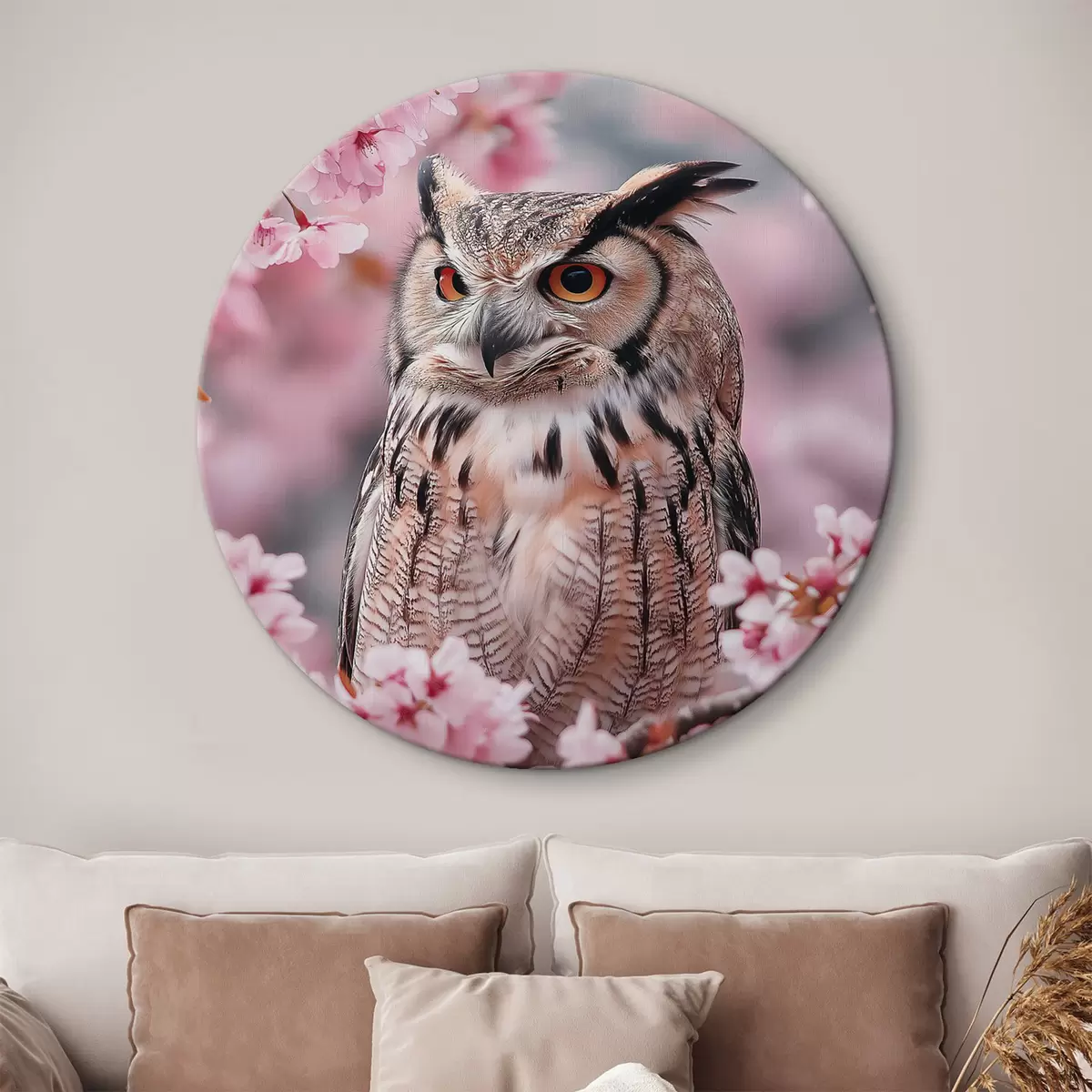 Runde Wandbilder Schöne Eule auf dem Zweig eines Kirschbaums, Natur, Realismus Nr r42784