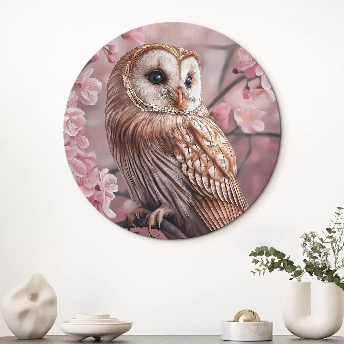Runde Wandbilder Eule auf dem Kirschbaum, rosa Blumen, Realismus, Natur Nr r42785