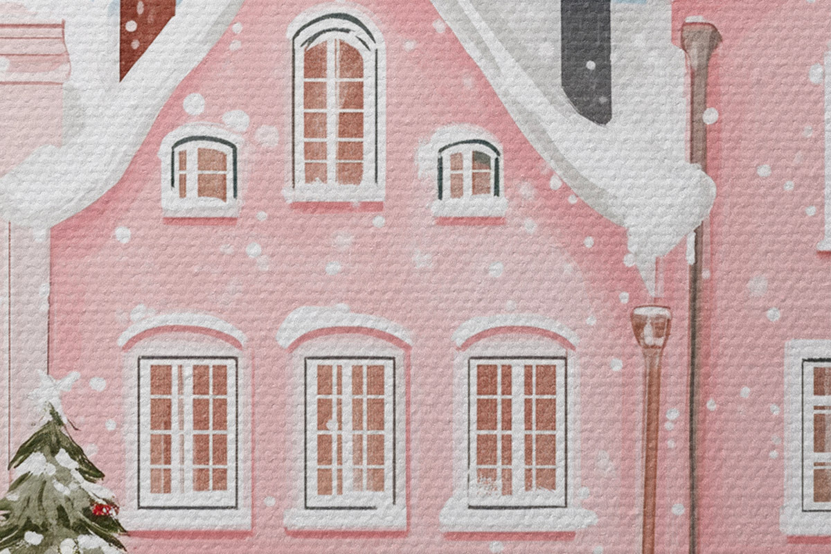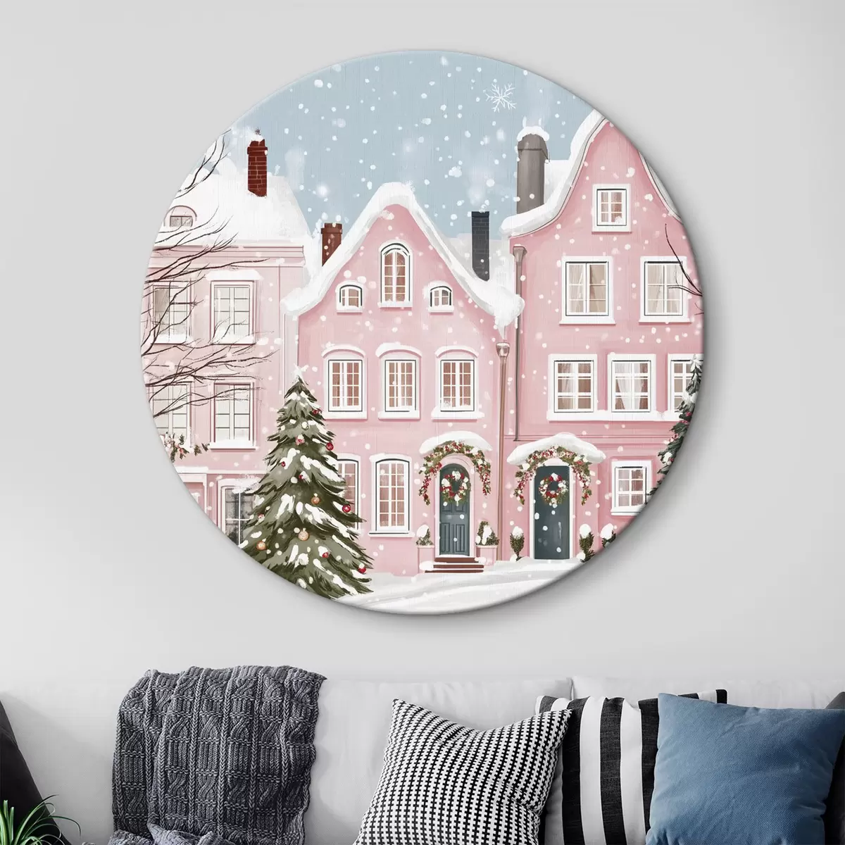 Runde Wandbilder Schöne Stadt mit niedlichen rosa Häusern, Winterästhetik, Schneeflocken Nr r42793