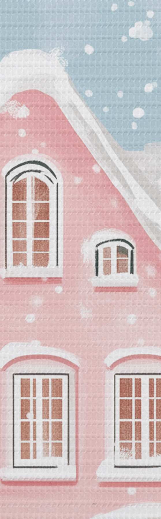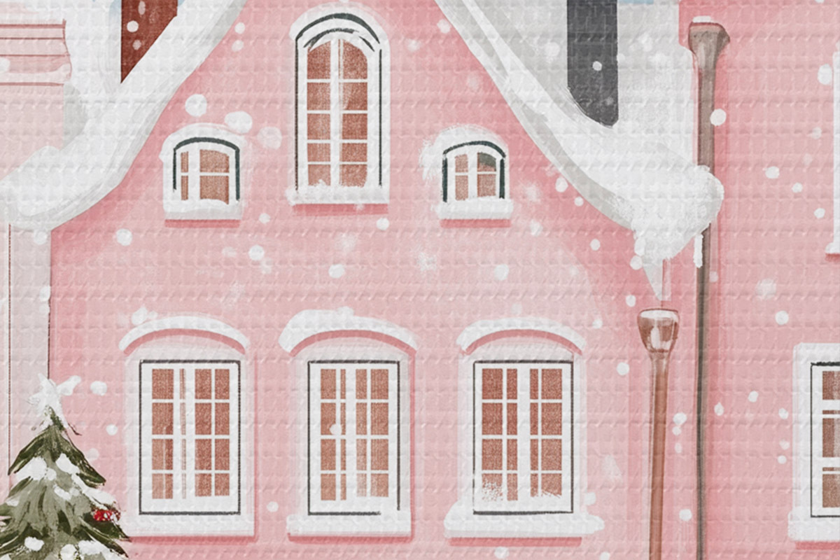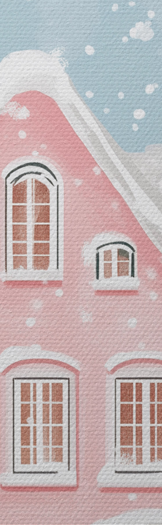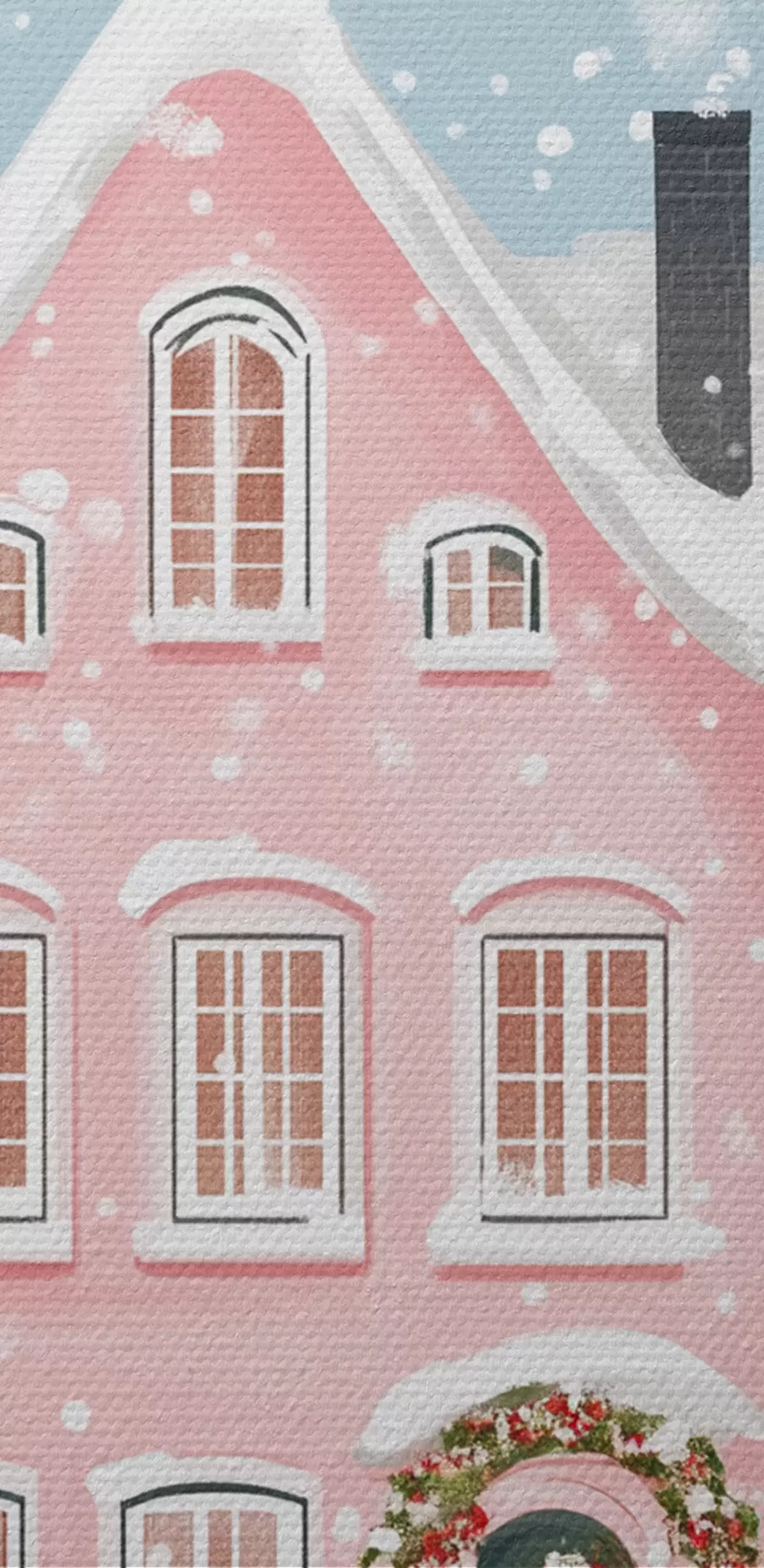 Runde Wandbilder Schöne Stadt mit niedlichen rosa Häusern, Winterästhetik, Schneeflocken r42793
