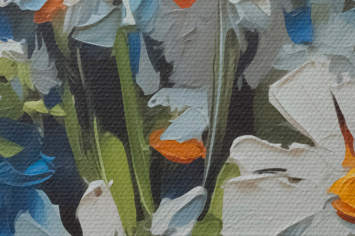 Drei Materialtypen stehen zur Verfügung: Economic Canvas - ein dichtes und haltbares Material für den Digitaldruck, identisch mit Malerleinwand, wasserfeste Oberfläche, realistische Wiedergabe von Details, mittelkörniges Material. Premium Canvas - die Textur ähnelt der einer Malerleinwand (verwobene kleine Fäden). Weiche, detaillierte Wiedergabe des Bildes auf einer matten Oberfläche. Eco-Premium - hochwertiges Gewebe aus 100% Baumwolle. Dank der natürlichen Baumwollfasern ist das Material langlebig und verschleißfest. Hervorragende Farbwiedergabe und Detailtreue.
