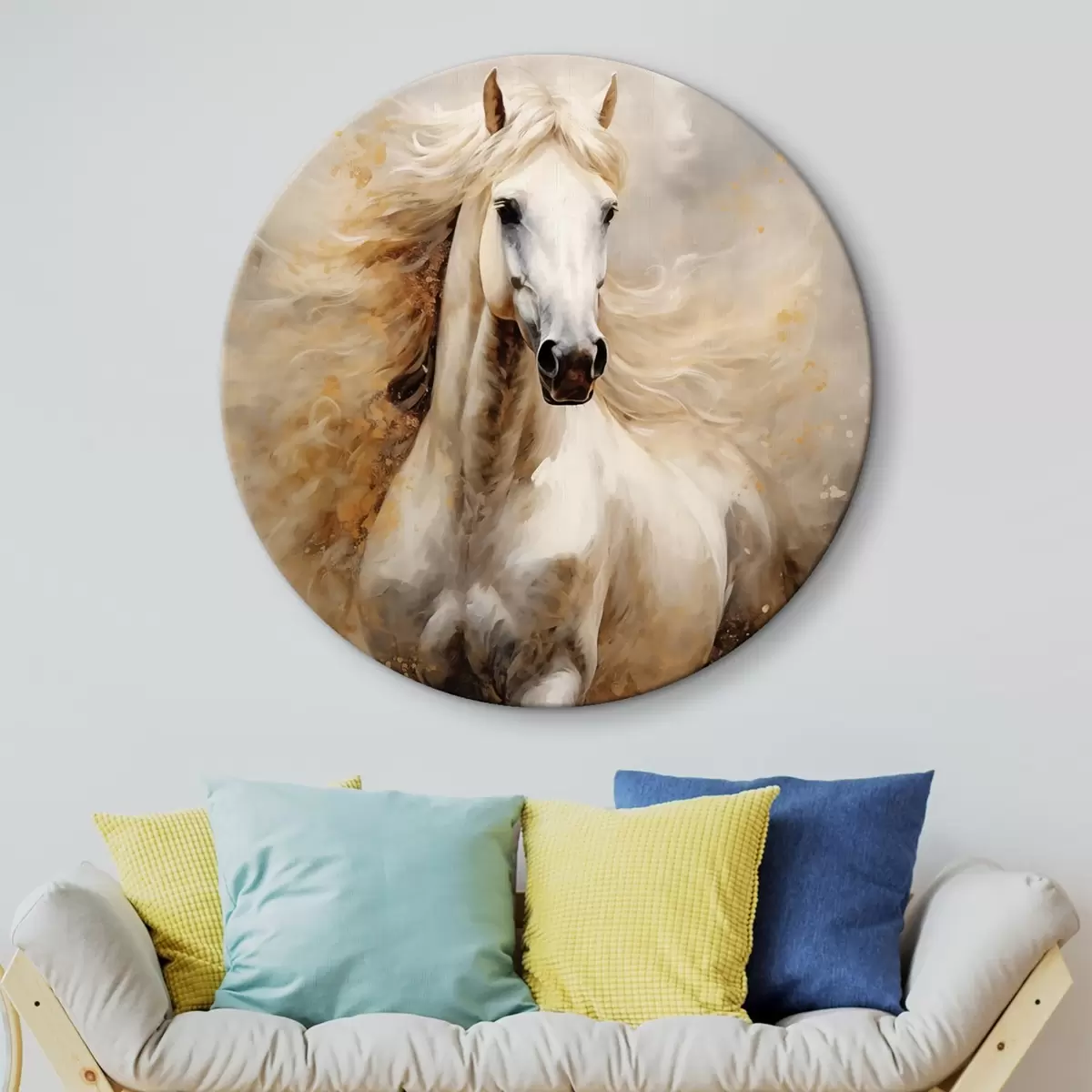 Runde Wandbilder Malerisches Porträt eines weißen Pferdes in Bewegung r42932