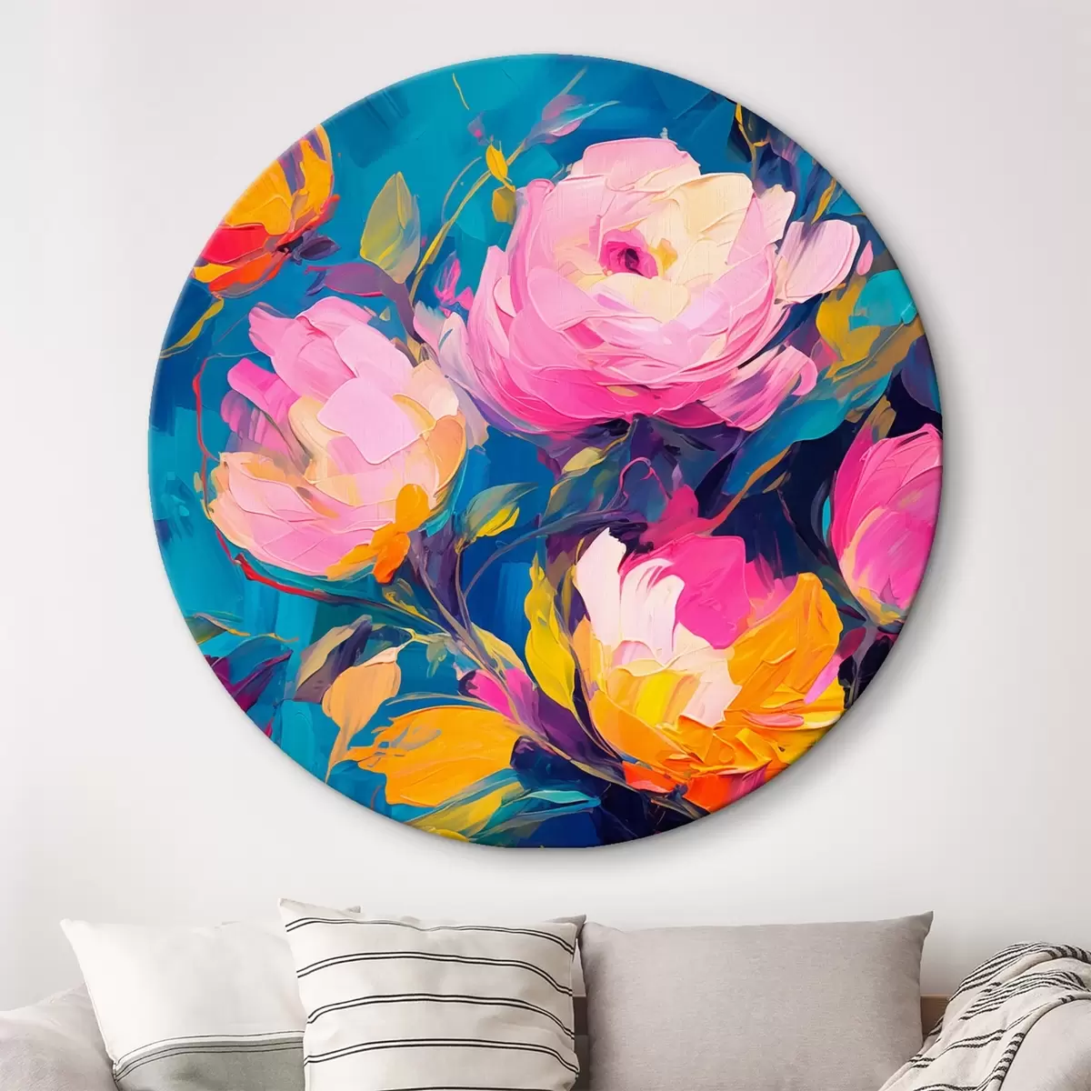 Runde Wandbilder Abstraktes Gemälde mit leuchtenden Blumen auf blauem Hintergrund r42941