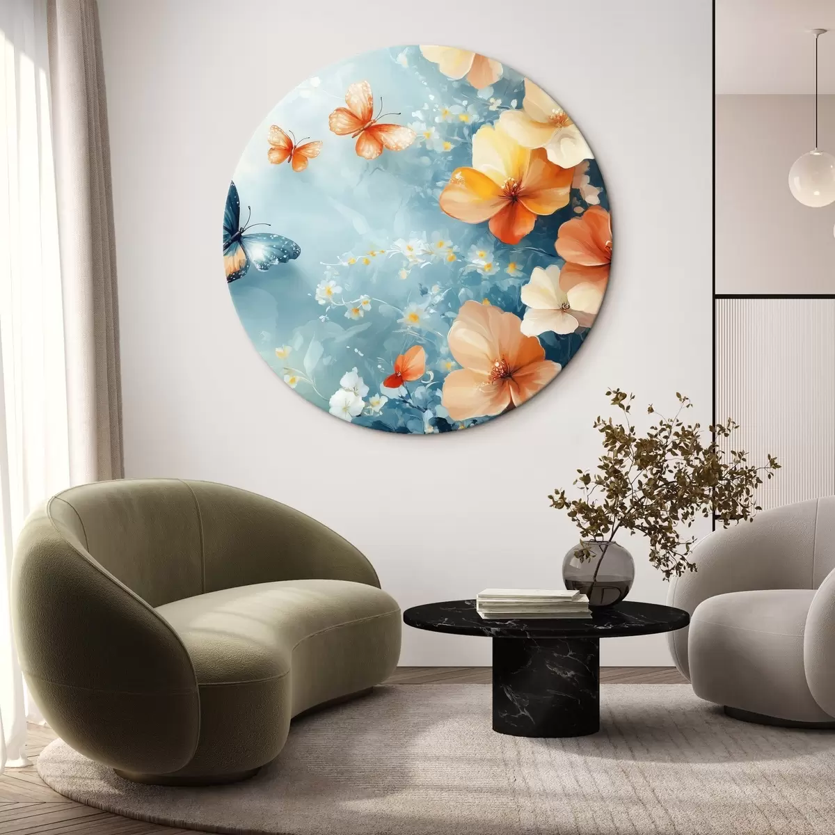 Runde Wandbilder Orangefarbene Blumen und Schmetterlinge Nr r42974