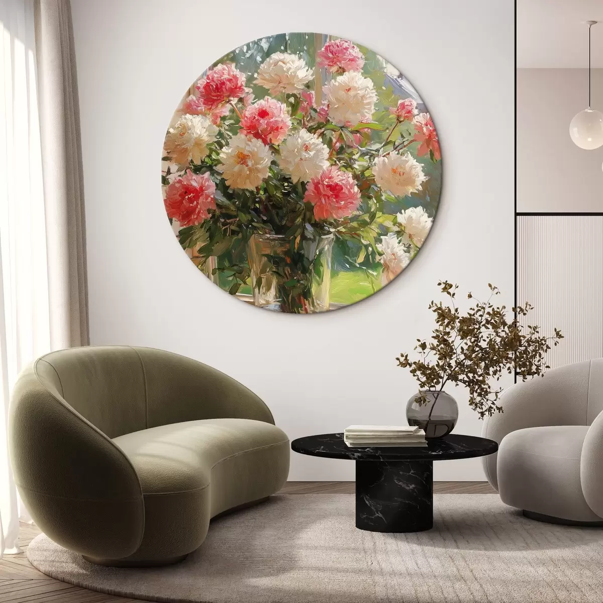 Runde Wandbilder Blumenstrauß am Fenster im Stil der Ölmalerei r42978