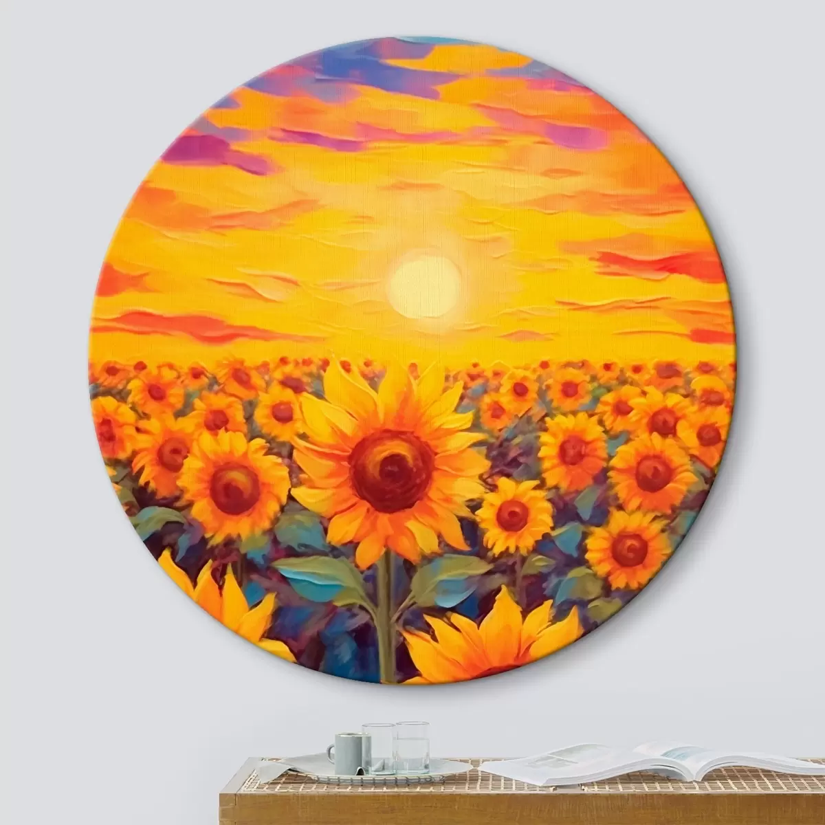 Runde Wandbilder Sonnenblumenfeld bei Sonnenuntergang r43010