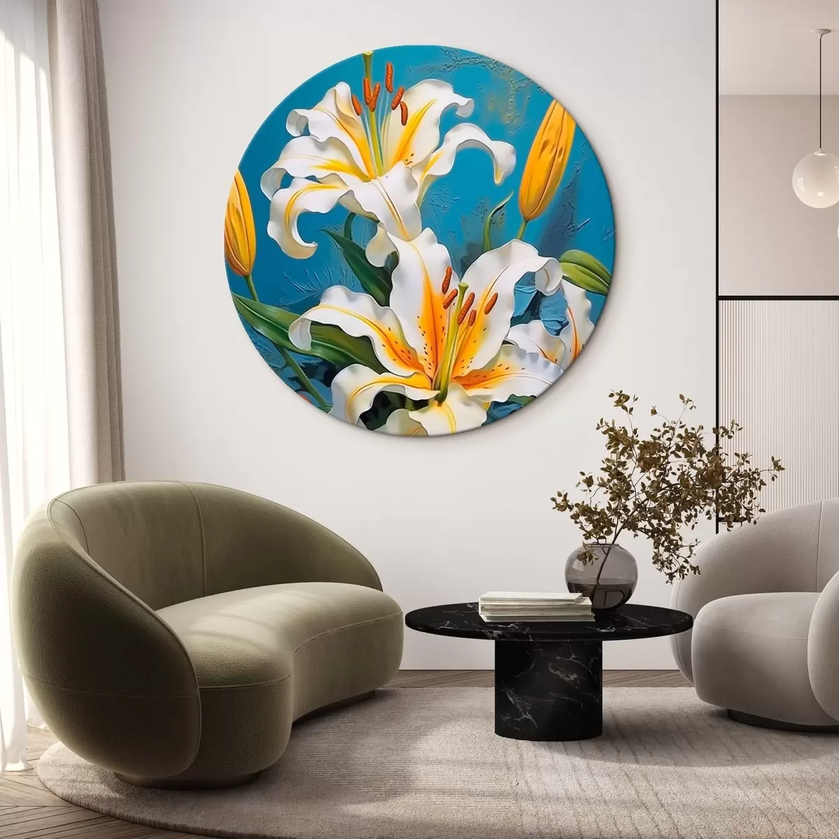 Runde Wandbilder Weiße Lilien auf blauem Hintergrund Nr r43018