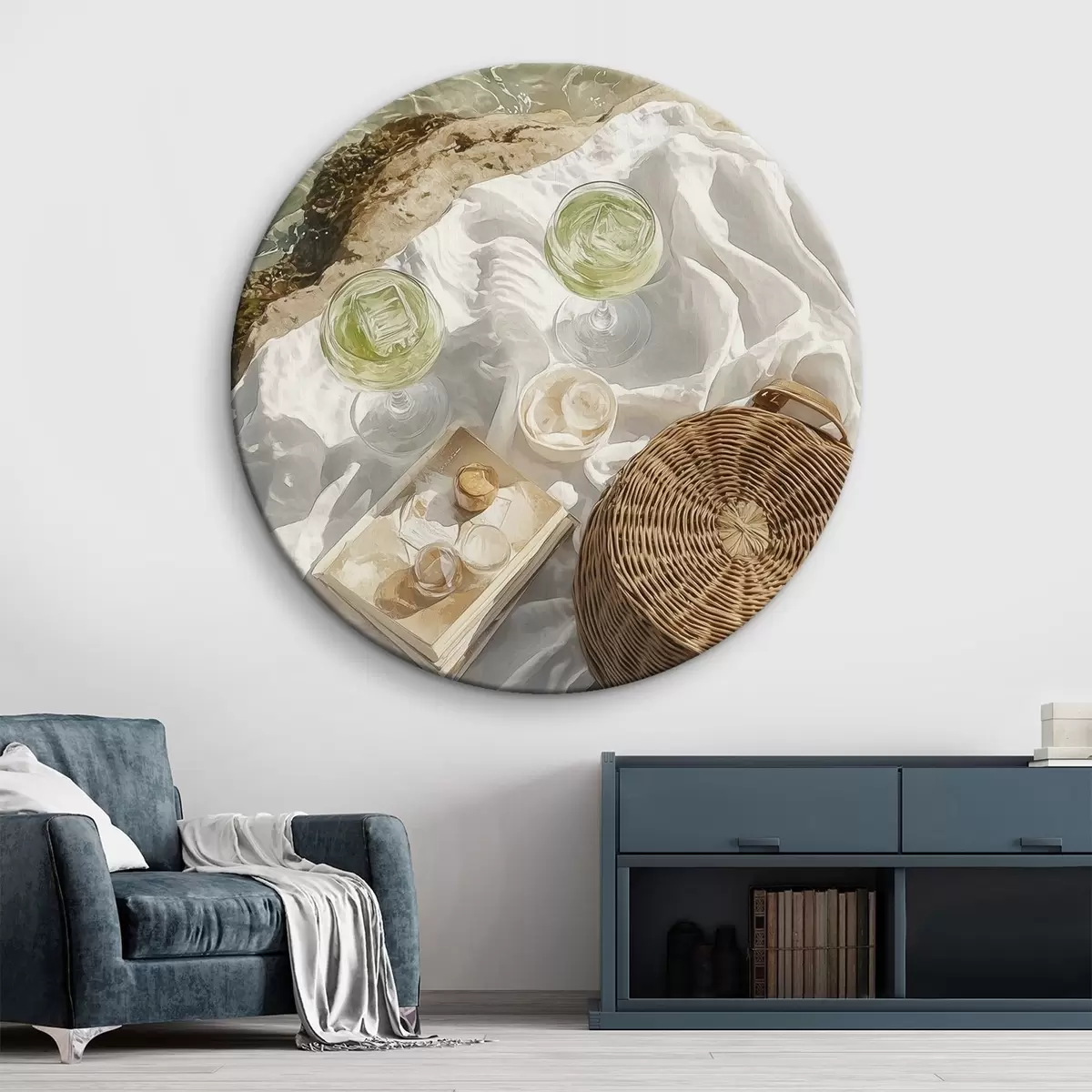 Runde Wandbilder Sommerästhetik, Meereswellen, Strand, Cocktails, Aquarellstil Nr r43069