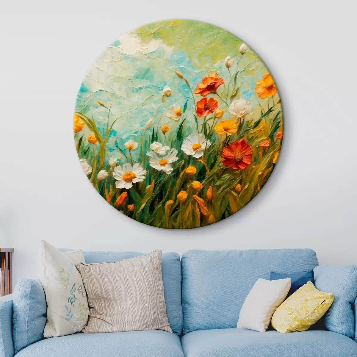 Runde Wandbilder Blumenfeld auf abstraktem Hintergrund mit blauem Himmel r43100