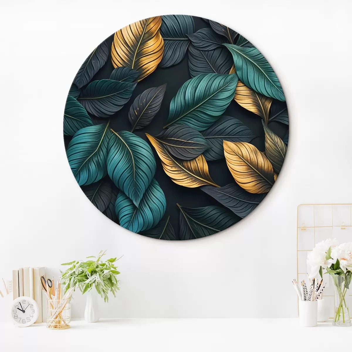 Runde Wandbilder Dunkelgrüne, gelbe und schwarze Blätter mit dunklen Adern, auf dunklem Hintergrund, elegante tropische Stimmung Nr r43164