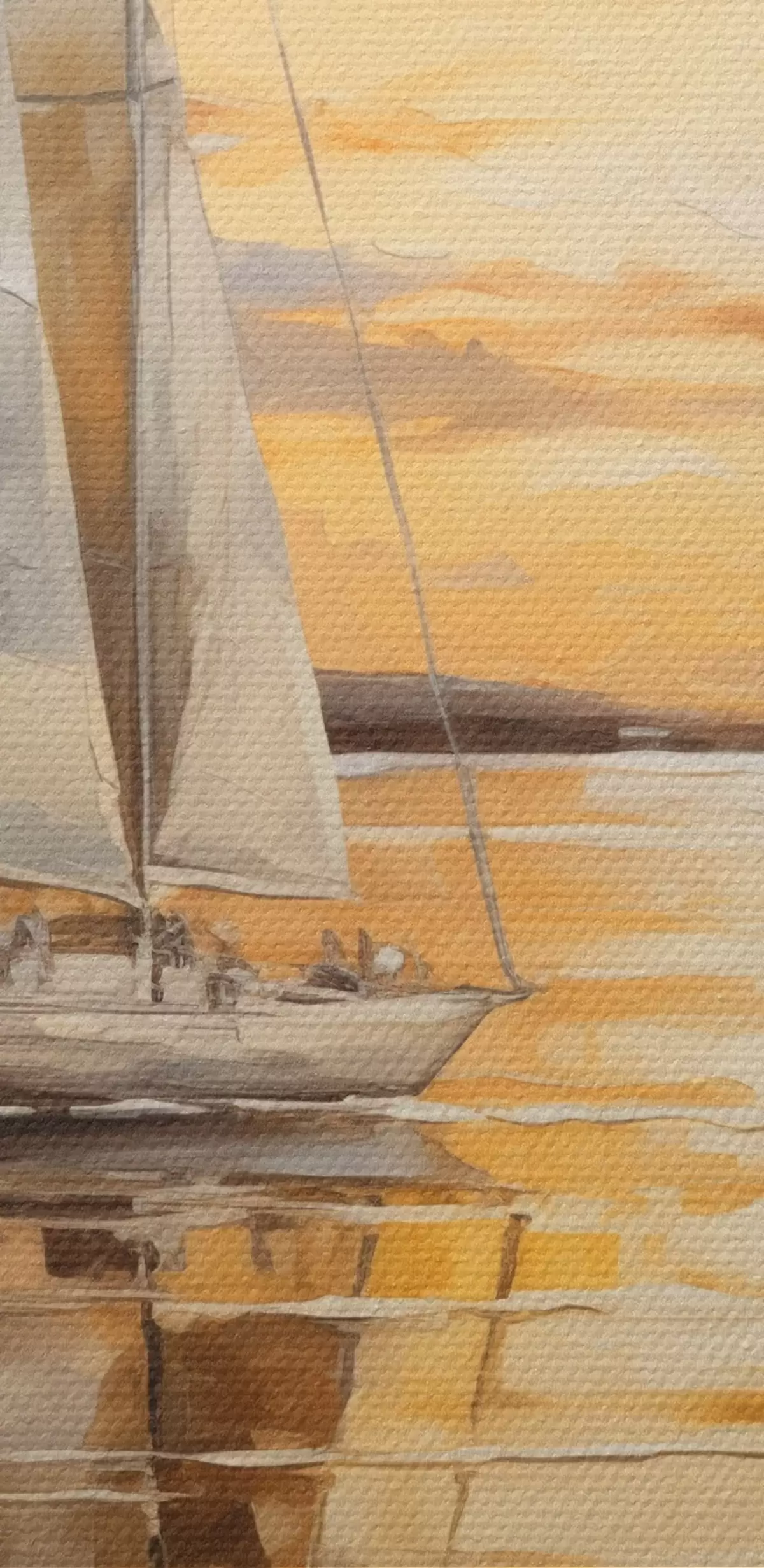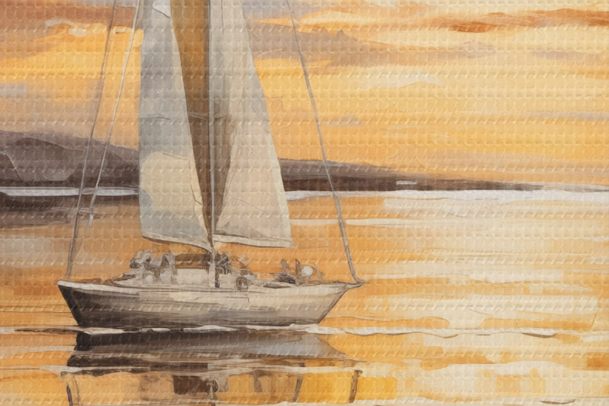 Runde Wandbilder Landschaftsgemälde mit einem Segelboot auf ruhiger See, orange-gelbem Himmel und fernen Bergen r43169
