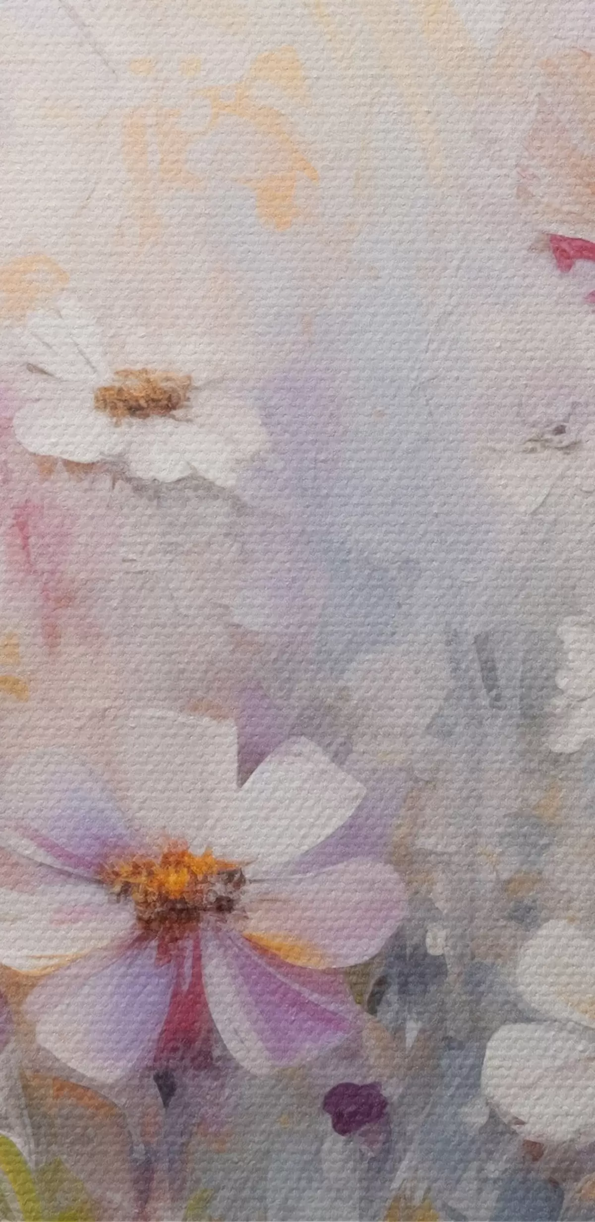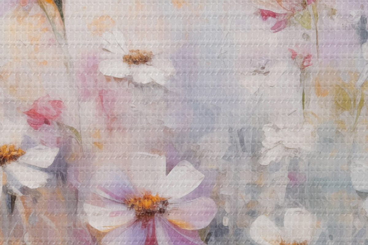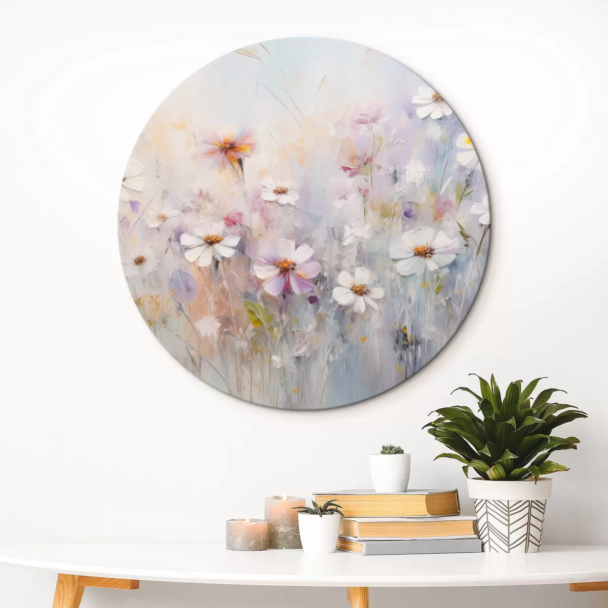 Runde Wandbilder Abstraktes, strukturiertes Feld mit weißen und rosa Blumen, weiche Pastellfarben, zarte Pinselstriche, Blumenwiese r43170