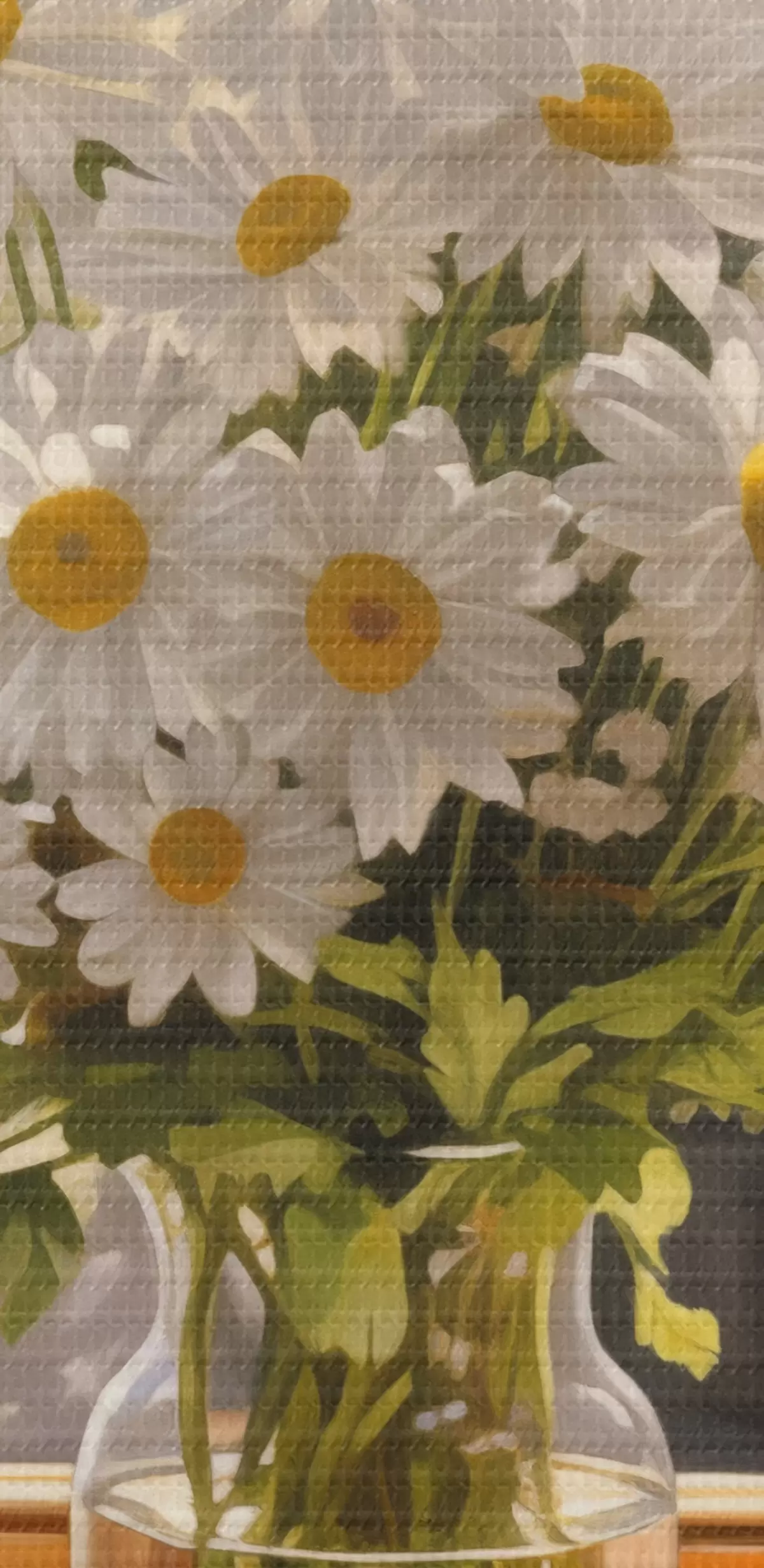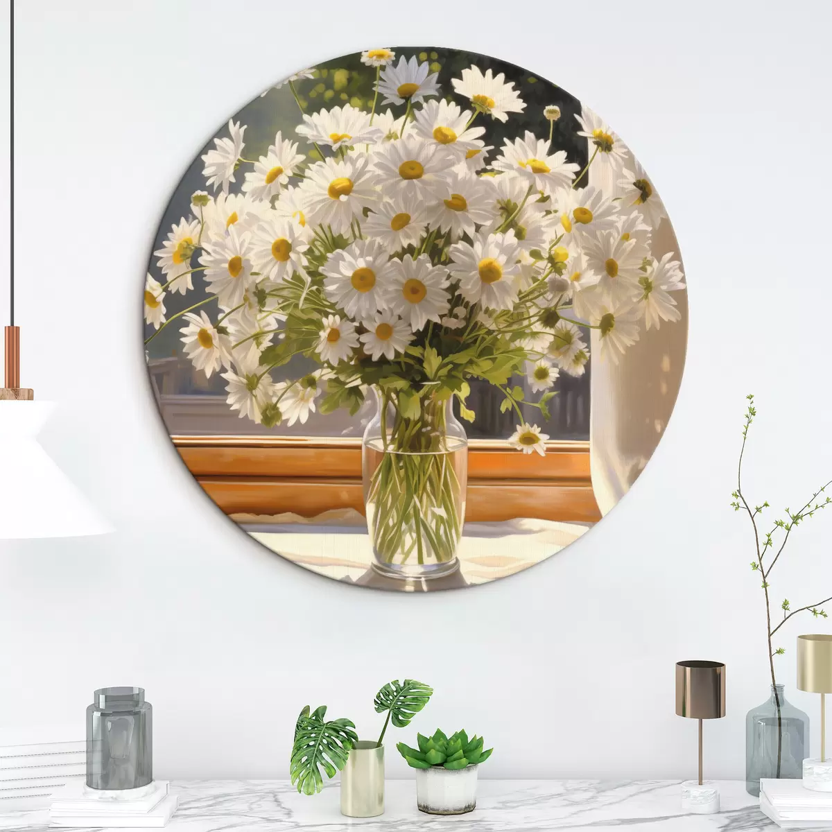 Runde Wandbilder Ölgemälde Nachahmung einer Vase mit weißen Gänseblümchen auf einer Fensterbank, sonniger Tag, warme Farben Palette Nr r43171