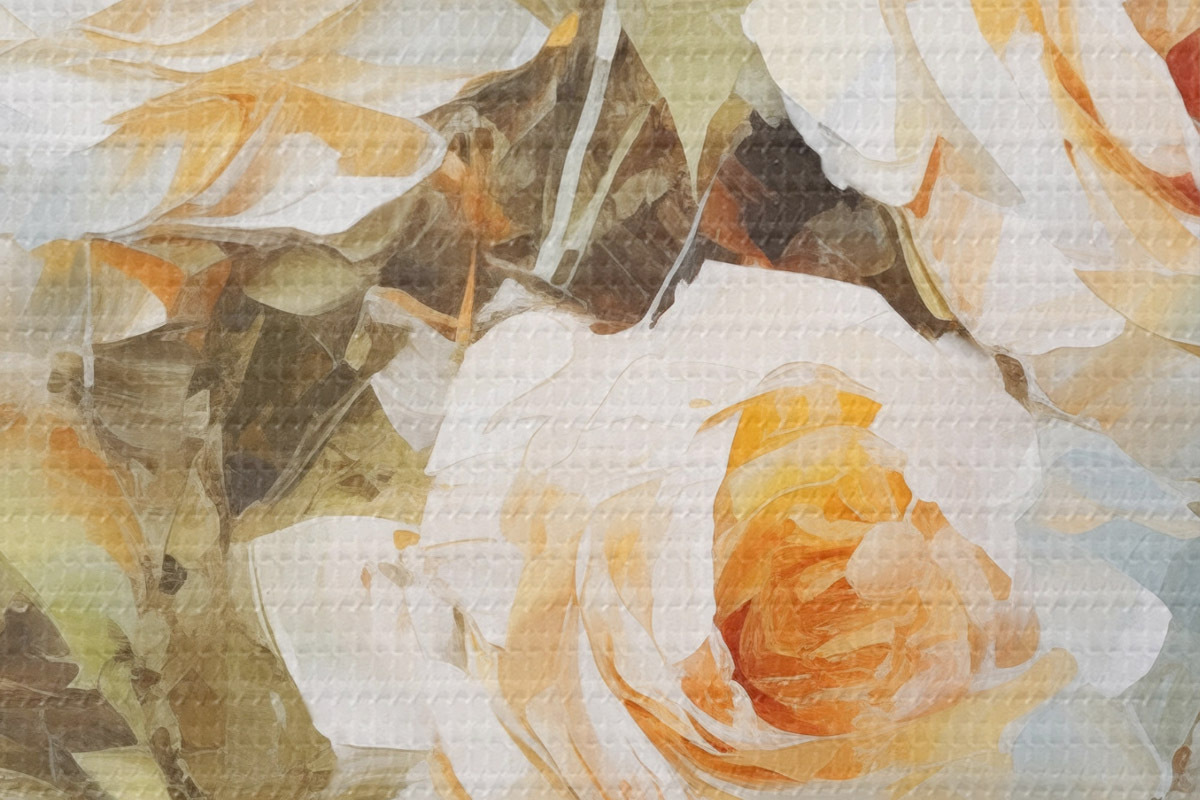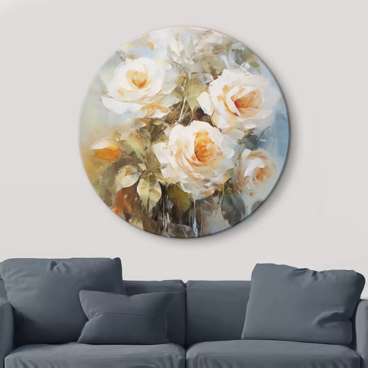 Runde Wandbilder Weiße Rosen mit Orange, vor einem weichen, hellblauen Hintergrund, mit sichtbaren Pinselstrichen und einem malerischen Stil r43175