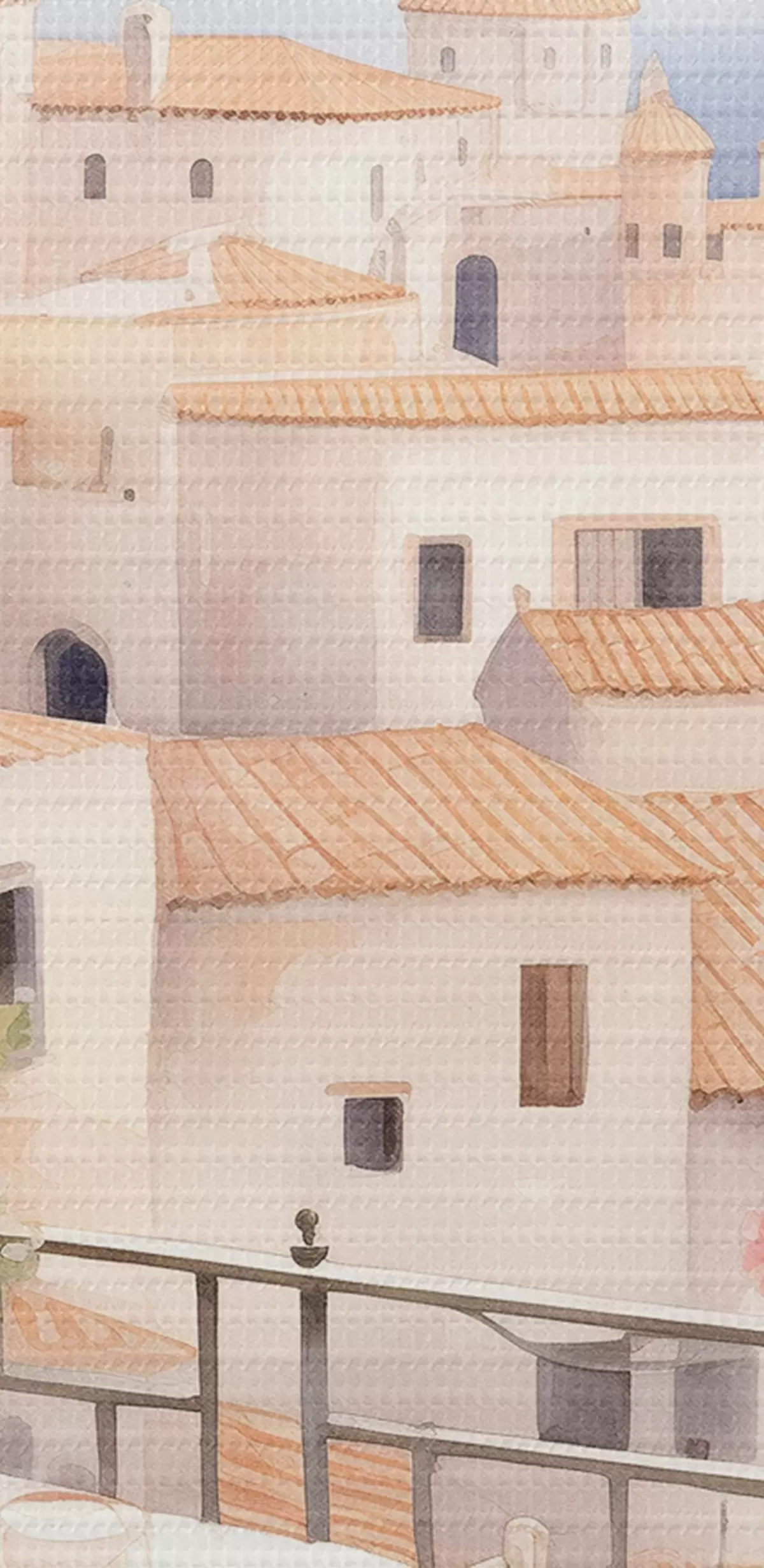 Runde Wandbilder Sonnenuntergang auf dem Balkon, Italien, Architektur, blühende Blumen, Aquarellstil r43184