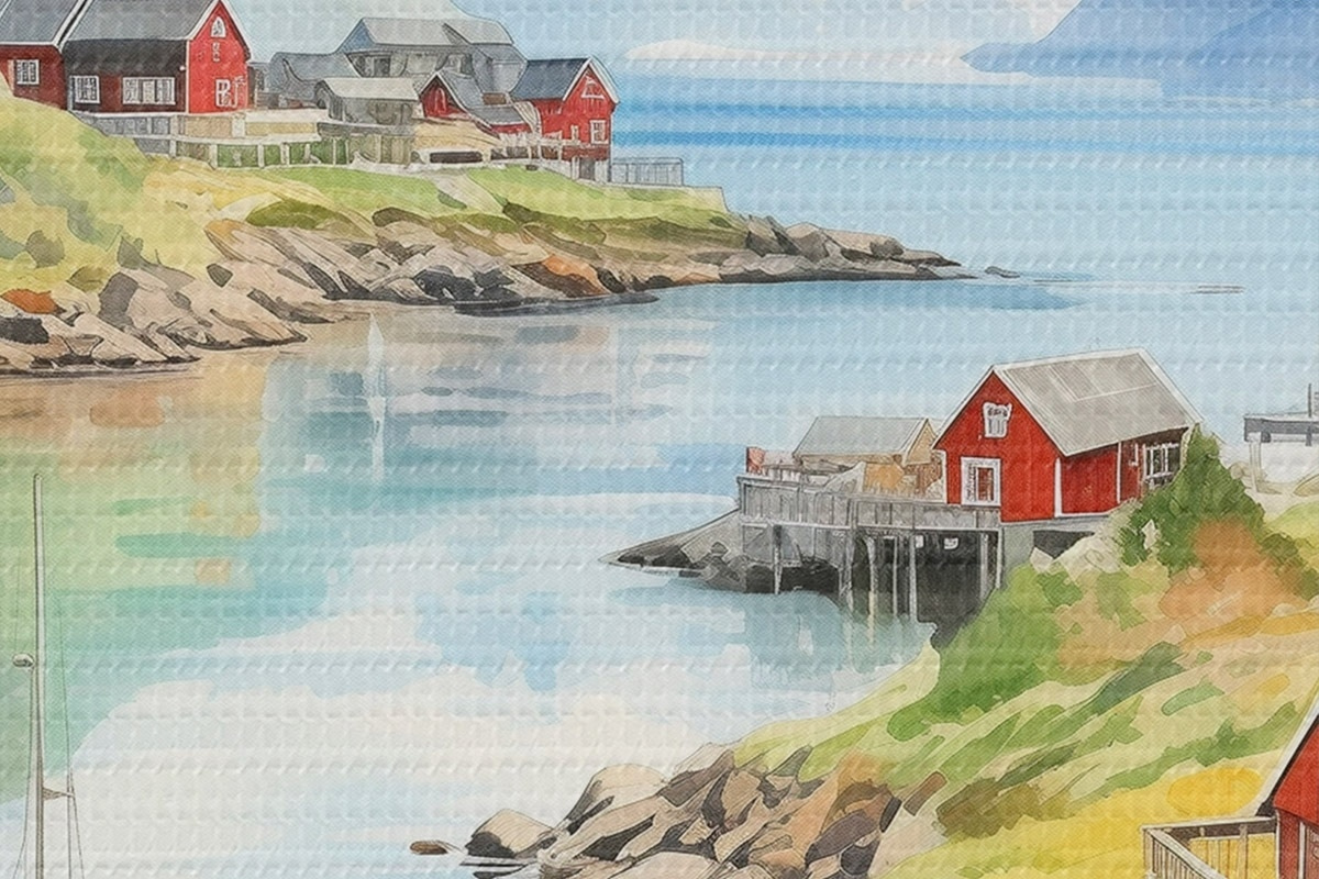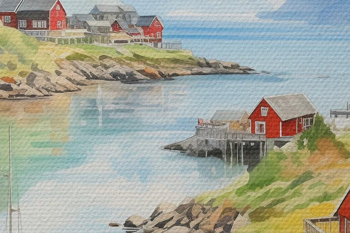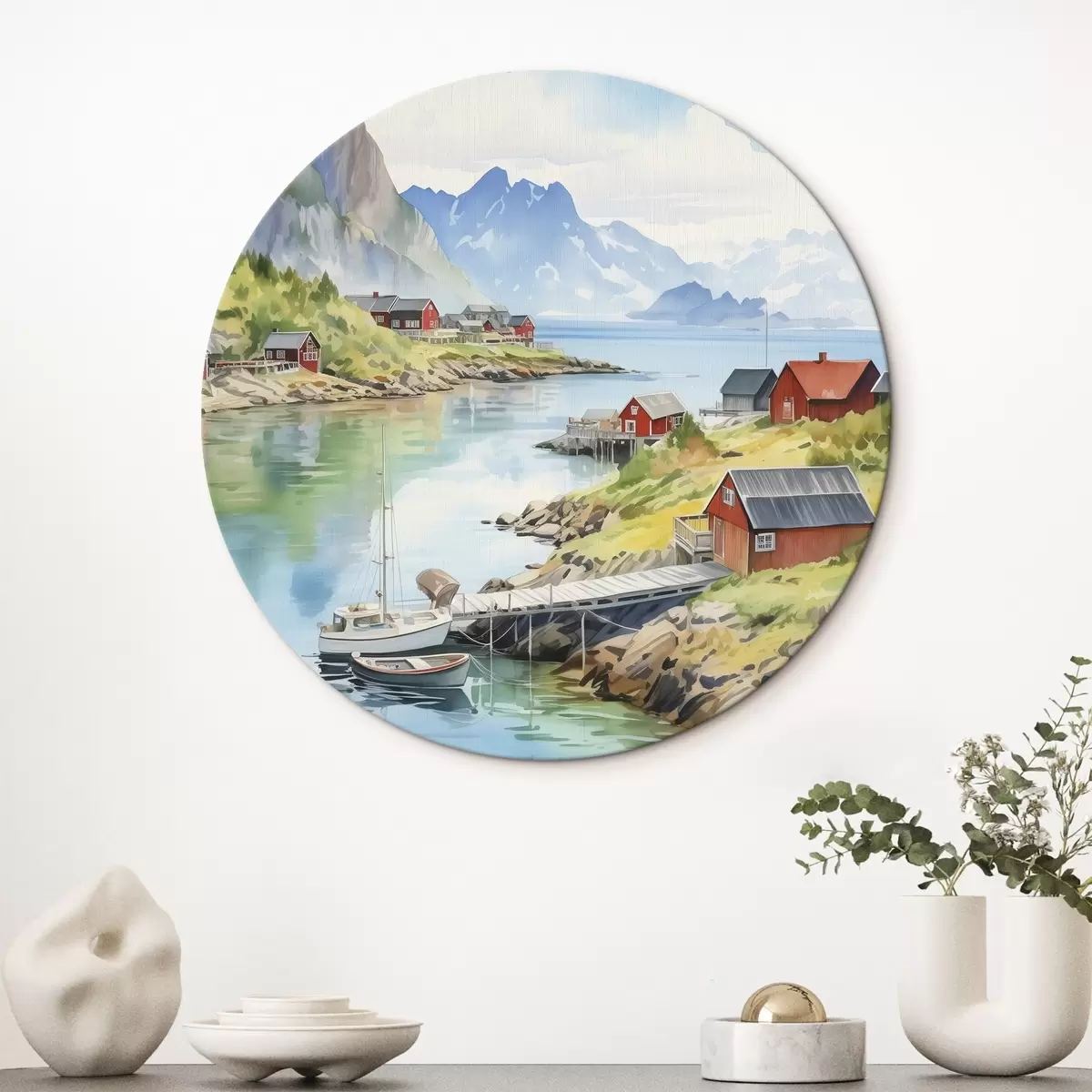 Runde Wandbilder Lofoten Inseln Sommerlandschaft, rote Häuser, Berge, Boote r43187