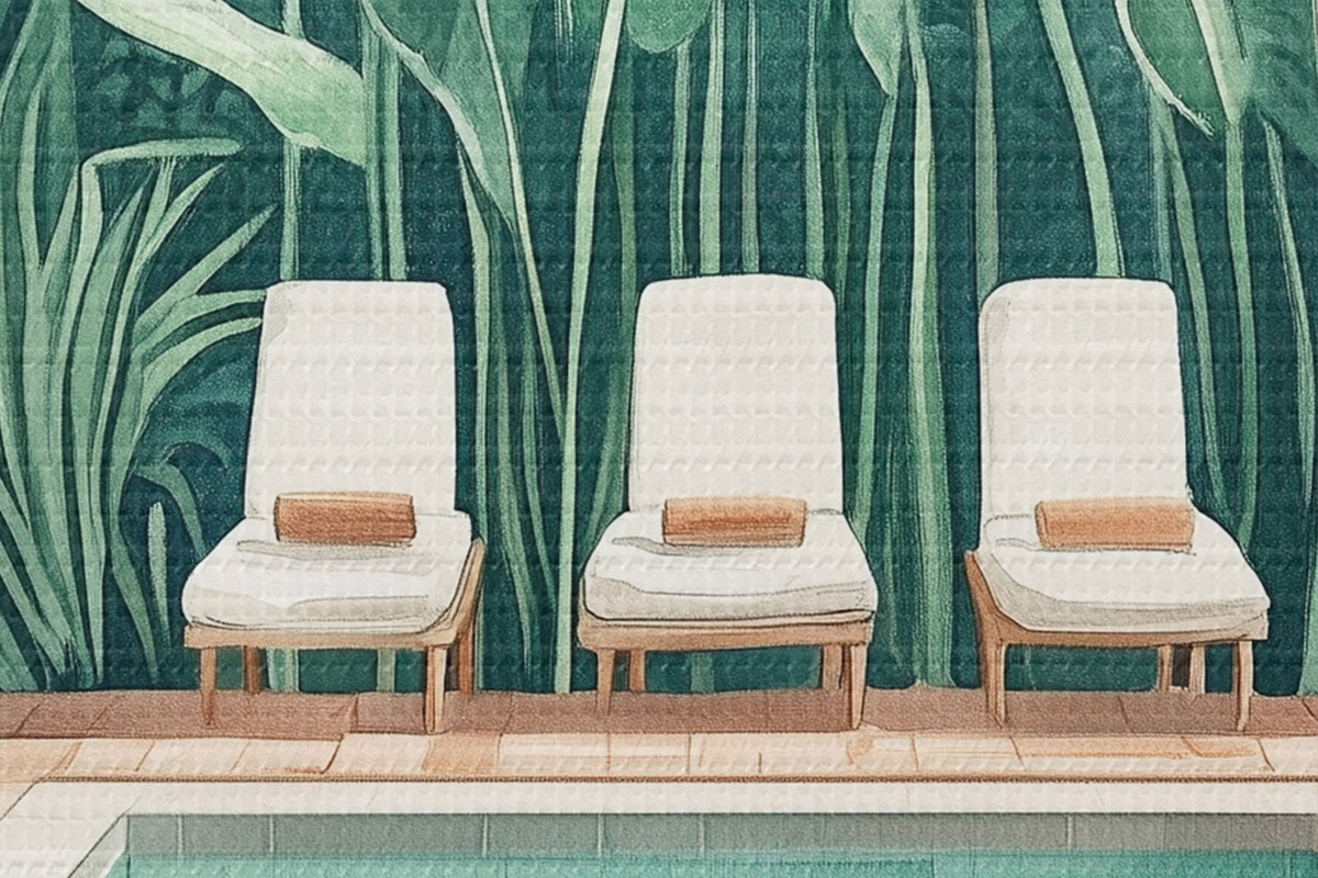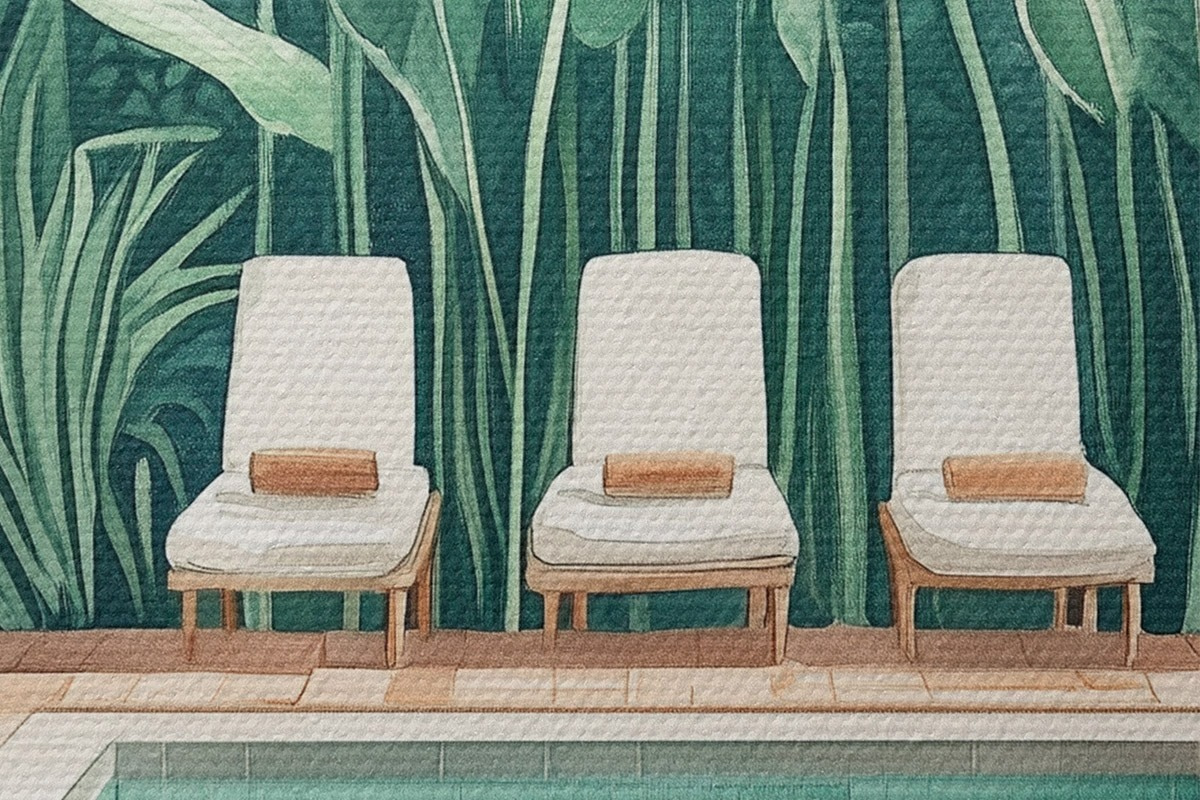 Runde Wandbilder Ästhetischer Sommerpool im tropischen Garten, Aquarellstil r43192