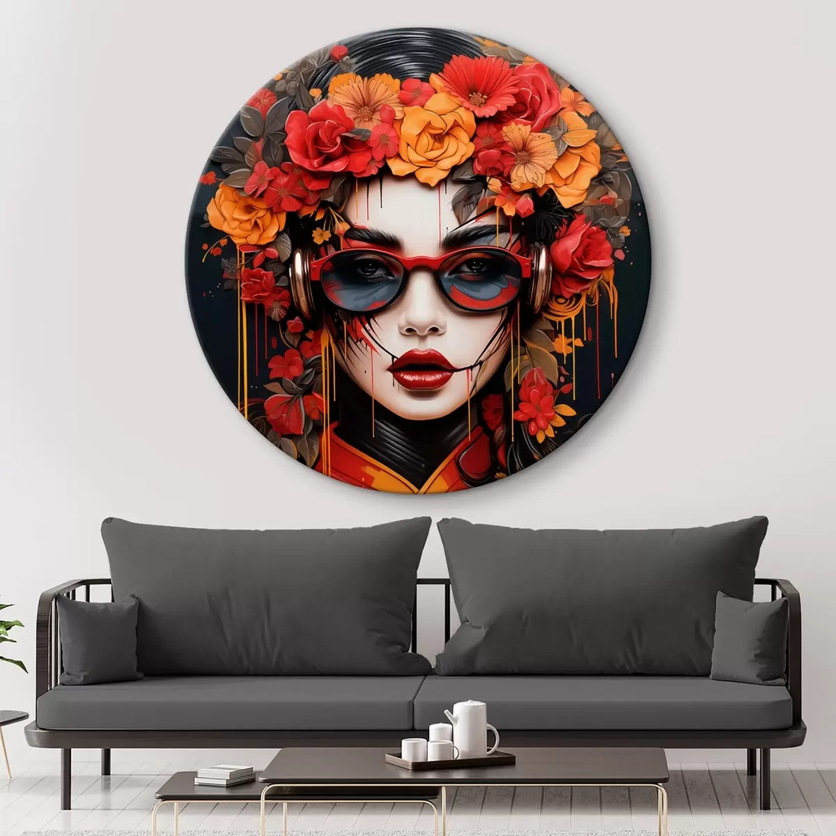 Runde Wandbilder Frau mit Blumen auf dem Kopf, Streetart-Stil r43362